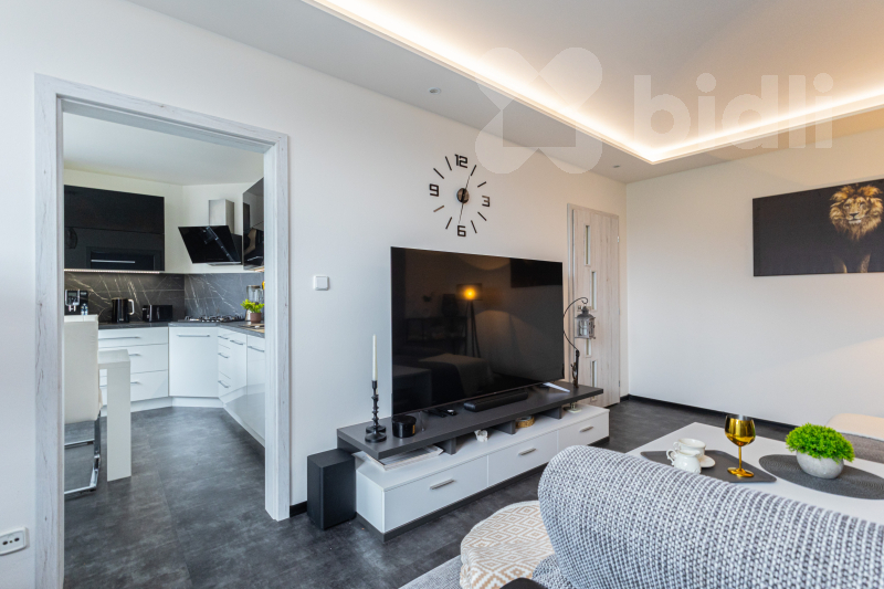 Byt prošel v roce 2022 kompletní a velmi kvalitní rekonstrukcí, která z něj dělá moderní a komfortní bydlení bez nutnosti dalších investic. V rámci rekonstrukce byly oškrábány původní nátěry až na panel a následně provedeny nové omítky ve všech místnostech včetně výmalby. Byly kompletně vyměněny rozvody elektřiny v celém bytě, realizovány snížené sádrokartonové stropy (mimo WC) a nové rozvody vody a odpadů v kuchyni a koupelně. Koupelna i WC prošly kompletní rekonstrukcí včetně obkladů, rozvodů a odpadu, přičemž koupelnový nábytek je vyroben na míru. V bytě byly odstraněny původní podlahy, provedena kompletní nivelace a položena kvalitní lepená vinylová podlaha v jednotném designu bez prahů. Kuchyňská linka je vyrobena na míru včetně vestavných spotřebičů a dostatek úložného prostoru zajišťují vestavěné šatní skříně na míru.