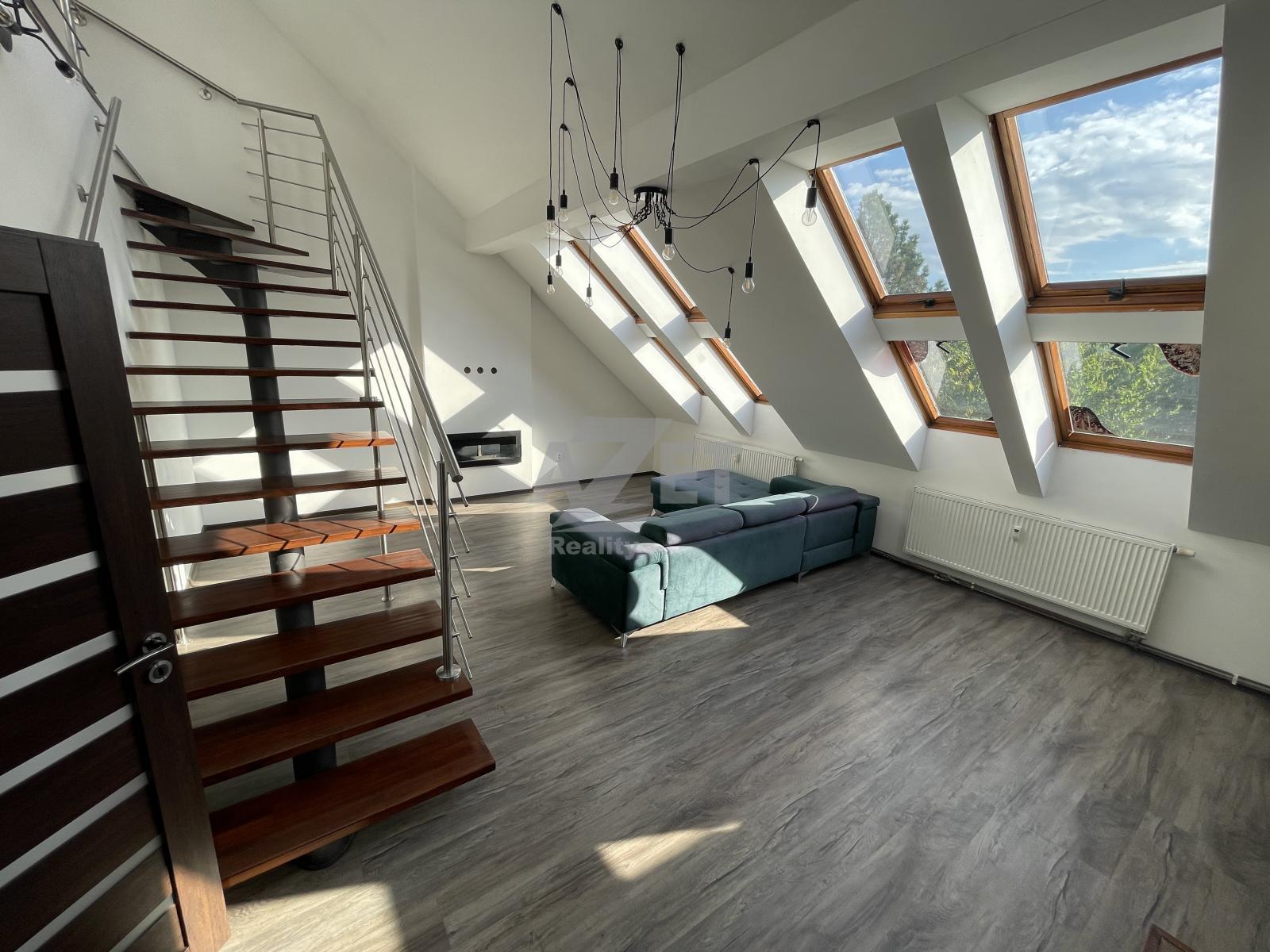 Vstupní chodba disponuje vestavěnou skříní na míru, která poskytuje velkorysý úložný prostor. Hlavní obytná místnost je světlá a vzdušná, s originálním schodištěm vedoucím do podkroví, kde se nacházejí samostatné pokoje vhodné jako ložnice a dětský pokoj. Díky této dispozici je byt velmi variabilní a umožňuje vytvořit si skutečně osobité bydlení podle vlastních potřeb.