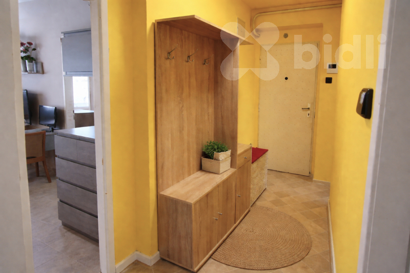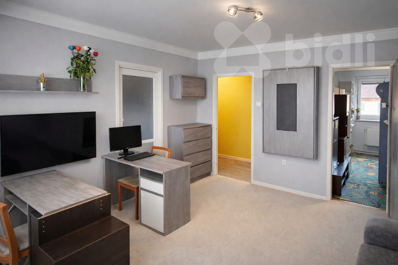Dispozice bytu je prakticky řešena. Ze vstupní chodby je samostatný vstup do koupelny a na WC, dále do kuchyně a obývacího pokoje. Z obývacího pokoje je vstup do dalšího pokoje. Menší pokoj je průchozí jak z kuchyně, tak z obývacího pokoje, což nabízí variabilní využití prostoru například jako dětský pokoj, pracovna nebo šatna.