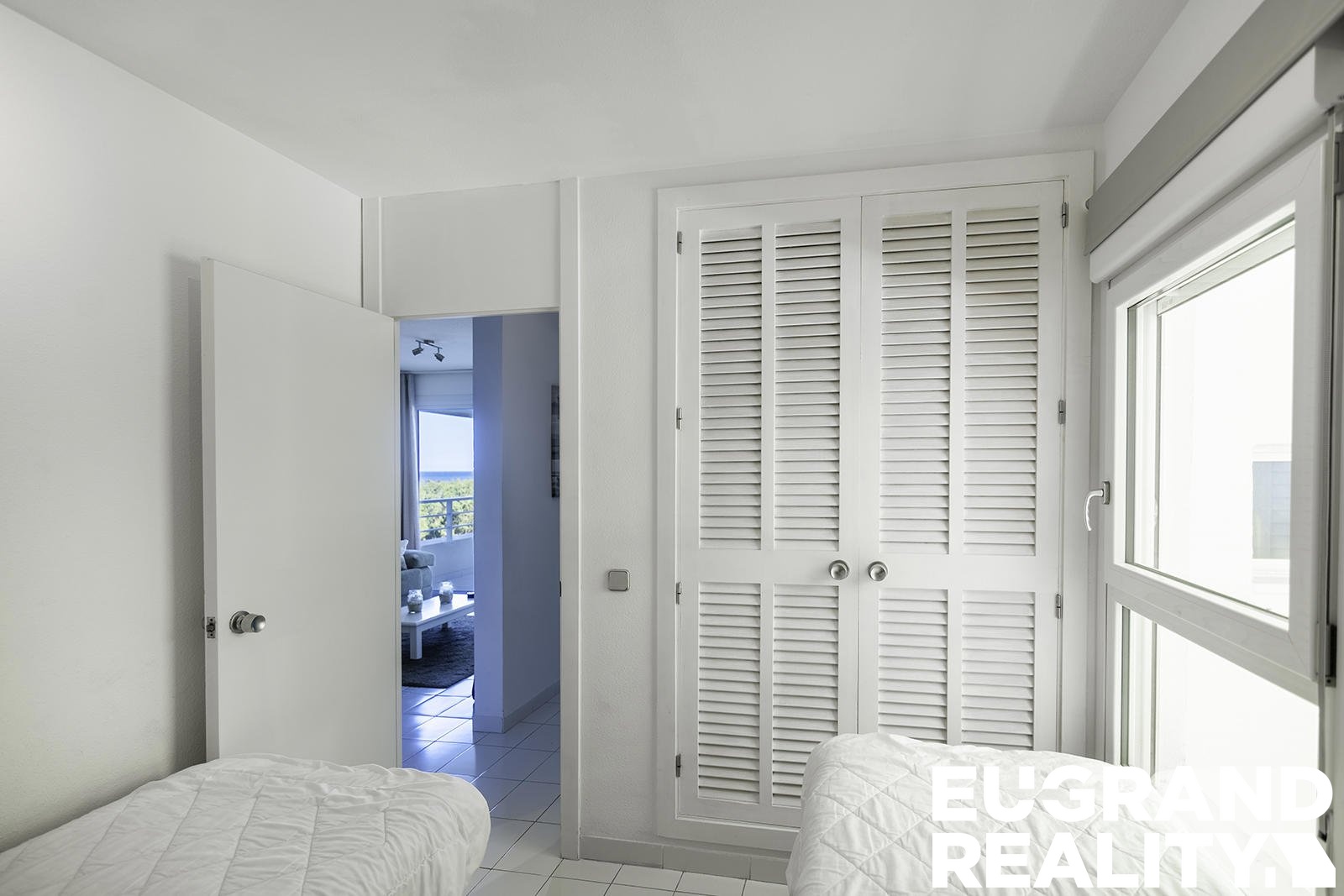 Dispozice bytu zahrnuje otevřený obytný prostor s obývacím pokojem, jídelnou a plně vybavenou kuchyní, dvě dvoulůžkové ložnice, koupelnu s vanou a sprchou a uzavřenou terasu s krásným výhledem na moře, přístupnou z hlavní ložnice.