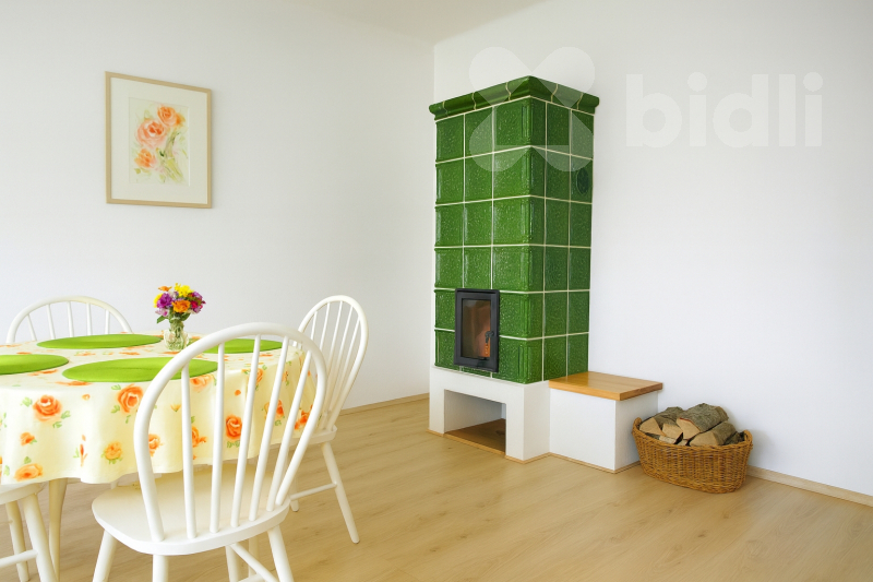 Vytápění zajišťuje elektřina a také krásná kachlová kamna, která dodávají bytu velmi příjemnou a jedinečnou atmosféru.