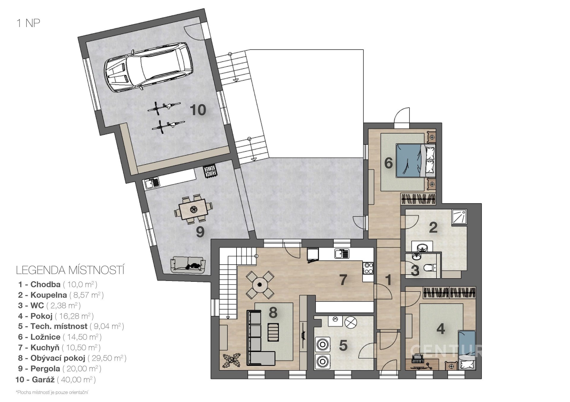 K domu náleží prostorná dvougaráž o velikosti 40 m², terasaaltán 20 m² a také vinný sklep, ideální pro milovníky vína.
