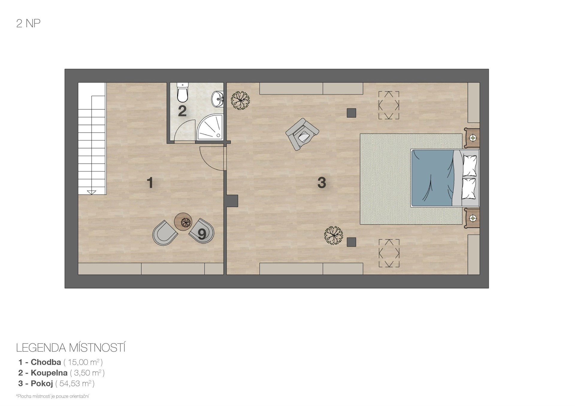 Podkroví o rozloze 87 m² nabízí další obytný prostor s koupelnou a toaletou – vhodné pro vybudování dalších pokojů, pracovny či samostatné bytové jednotky.