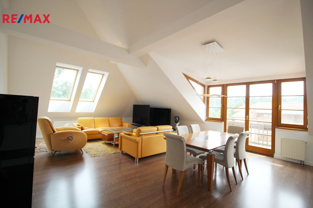 K dlouhodobému pronájmu nabízíme nadstandartní mezonetový byt 4+kk s dvěma balkony a dvěma terasami o celkové obytné ploše 211 m2, který se nachází ve třetím patře v cihlovém domě na náměstí obce Čeladná.