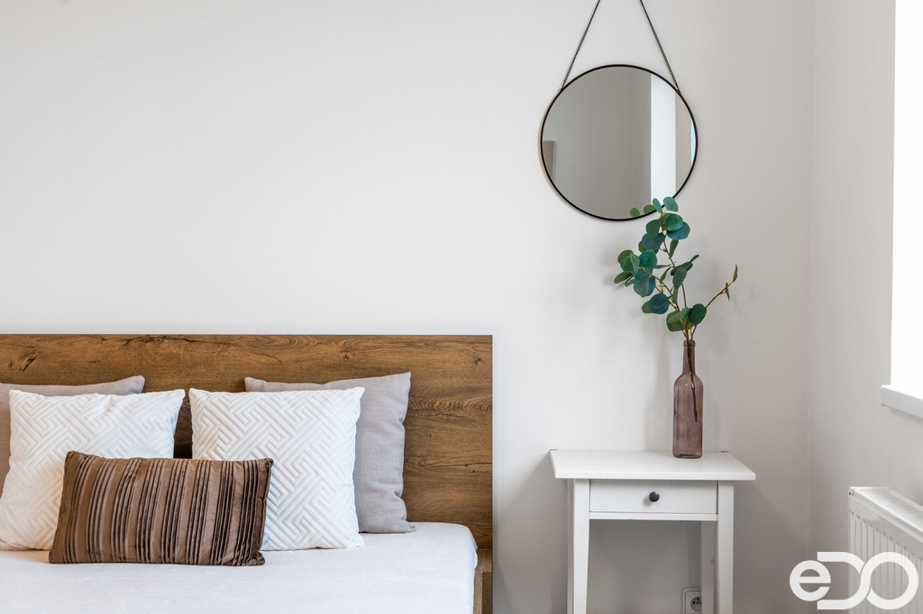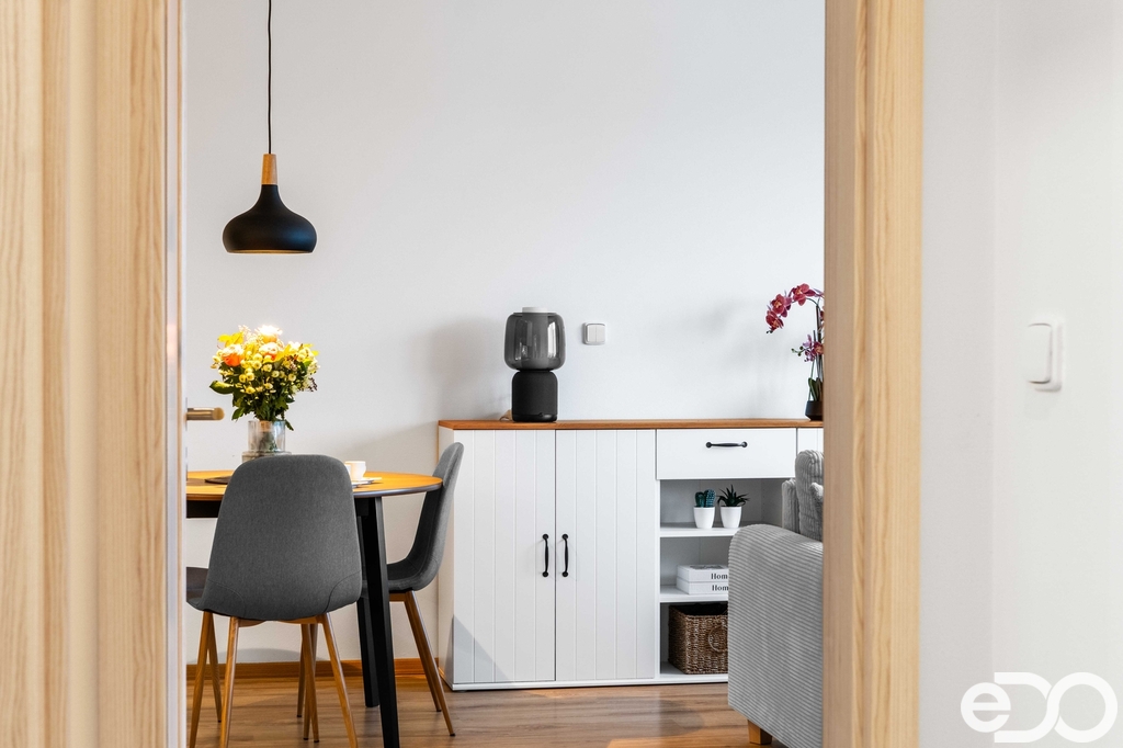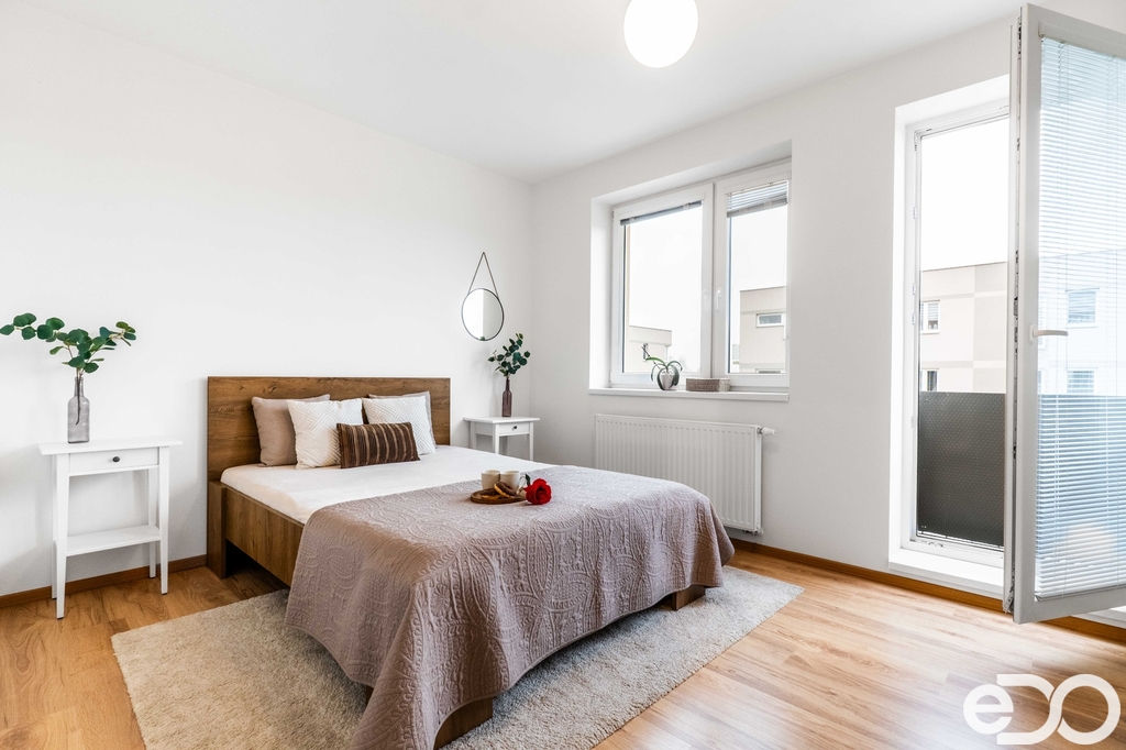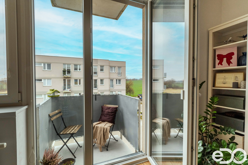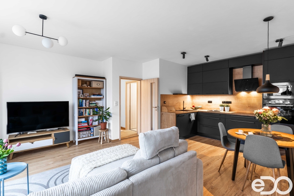 Byt se nachází ve 3. nadzemním podlaží s výtahem a má podlahovou plochu 62,8 m². Dispozice zahrnuje obývací prostor s kuchyní a přímým vstupem na balkon o velikosti 1,6 m². Otevřený a vzdušný charakter obývacího pokoje s kuchyňským koutem umožňuje kromě obývací sestavy pohodlně umístit i pracovní kout nebo knihovnu. Kuchyňská linka je vyhotovena na míru v černo-dřevěném dekoru a osazena spotřebiči Bosch. K bytu dále náleží sklepní kóje o velikosti 2,2 m². Vybavení bytu může zůstat dle dohody.
