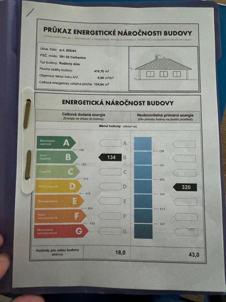 - Ukazatel energetické náročnosti budovy: 134 kWh/m²