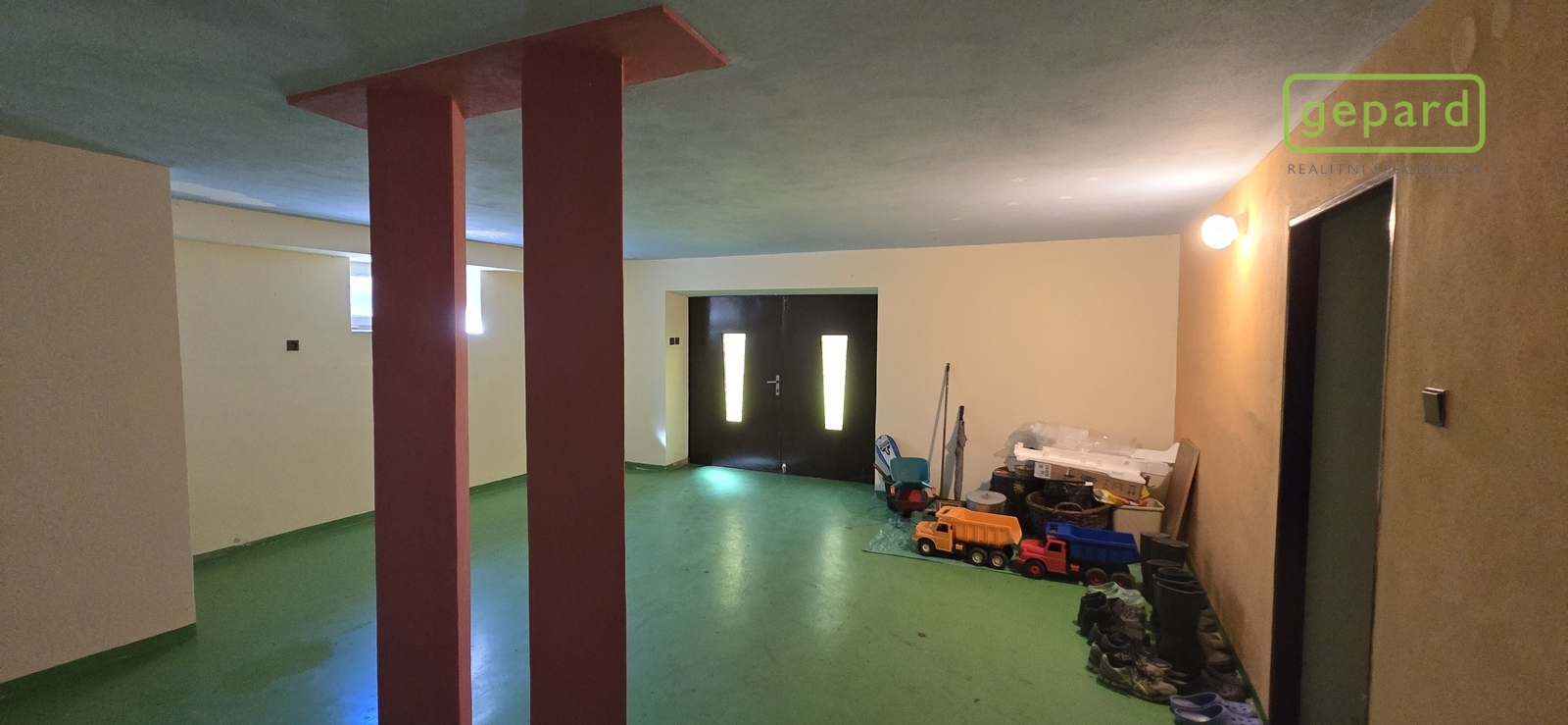 Suterénní část je tvořena prostornou garáží, technickým zázemím domu, skladovacími prostory hernou pro děti.