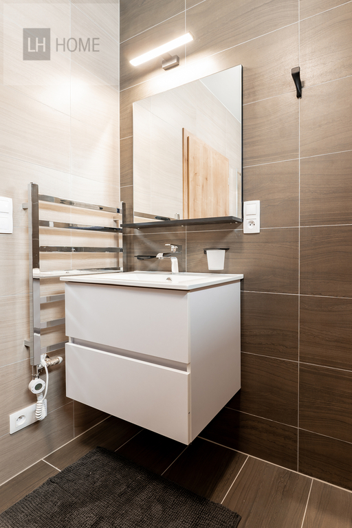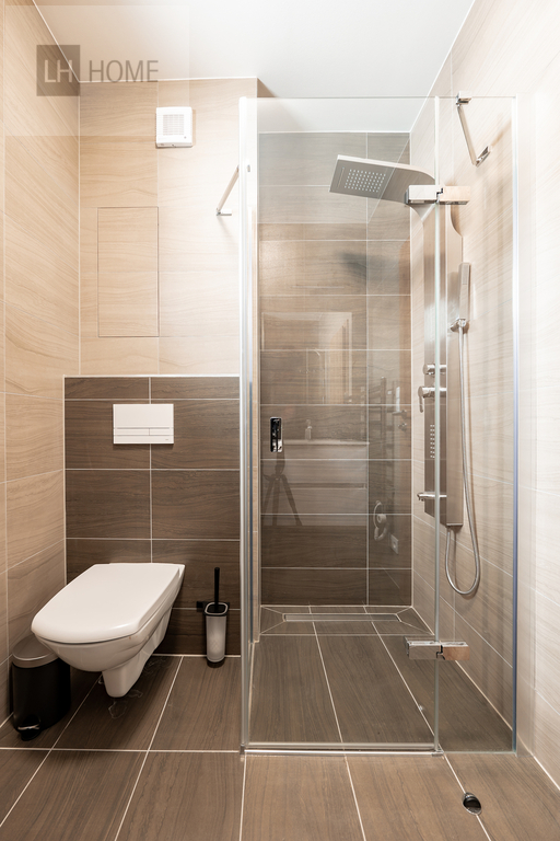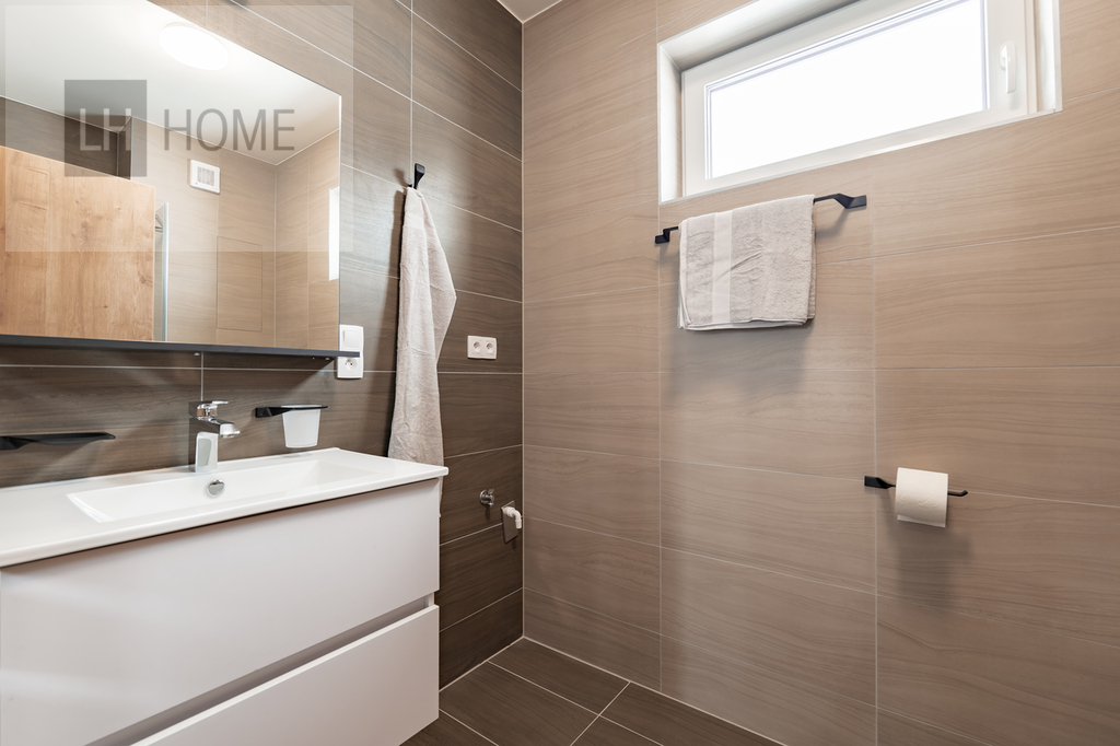 Dvě koupelny s nadstandardním vybavením: sprchový kout, skříňka s umyvadlem, závěsné WC a topný žebřík