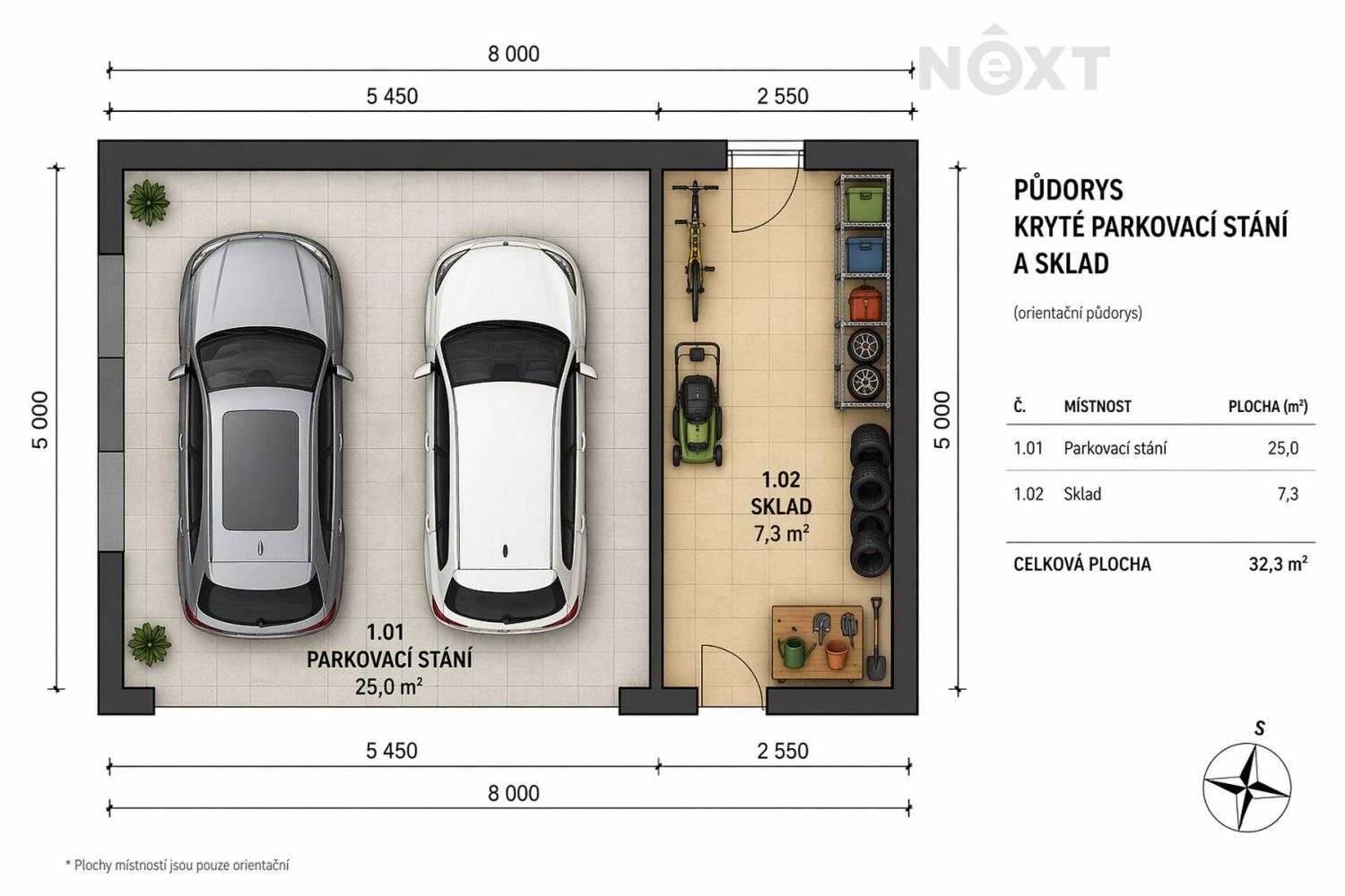 Na pozemku se nachází kryté parkovací stání pro 2 automobily a zahradní domek s úložným prostorem.
