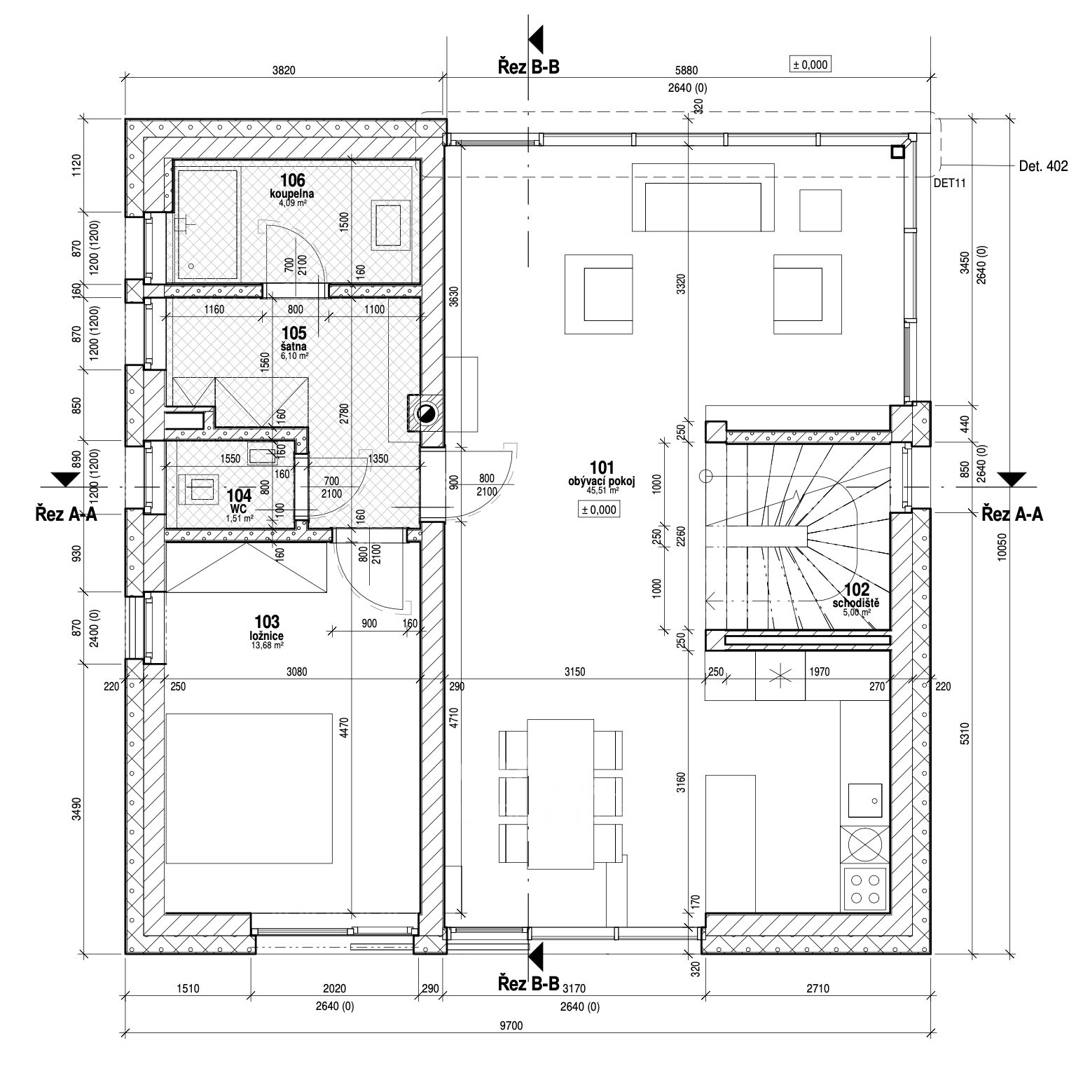 Součástí prodeje je projekt moderního rodinného domu o dispozici 5+kk s užitnou plochou 147 m² a garáží o velikosti 28 m². Návrh je koncipován jako praktické a nadčasové bydlení pro rodinu, která hledá rovnováhu mezi otevřeným společenským prostorem a dostatkem soukromí. Dispozice přirozeně pracuje se zahradou a orientací pozemku tak, aby obytná část domu těžila ze světla i výhledů do okolní zeleně. Odhadovaná cena postavení domu je kolem 8 milionů korun*.