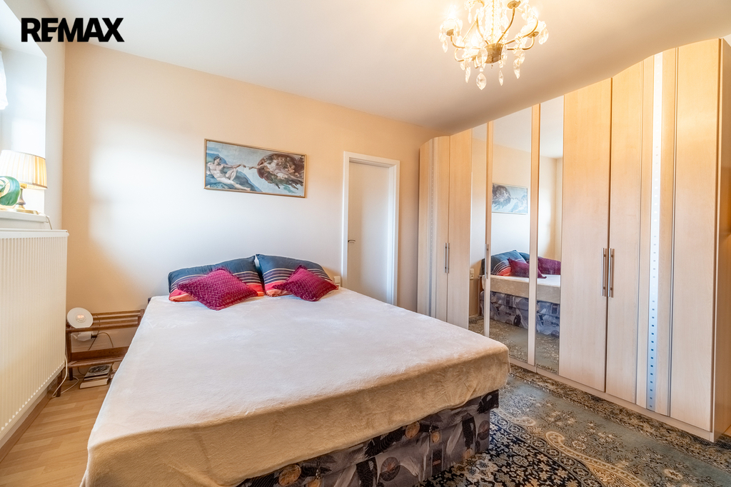 Horní patro (2. NP) – 4 pokoje s vlastní koupelnou a WC, 2 pokoje mají francouzský balkon; každý člen domácnosti má své soukromí.