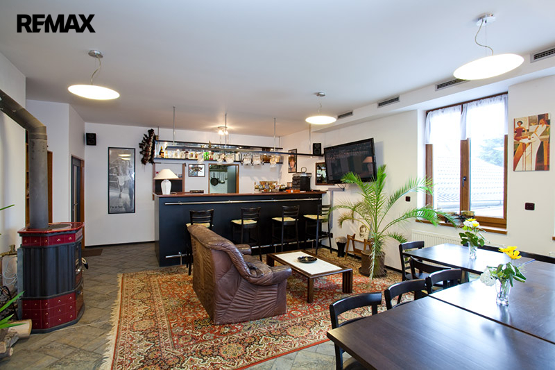 Střední patro (1. NP) – velký obývací pokoj s kuchyní a jídelnou, přístup na prostornou terasu s výhledem do okolní krajiny; možnost přeměny bývalé restaurace na centrální obytnou část.