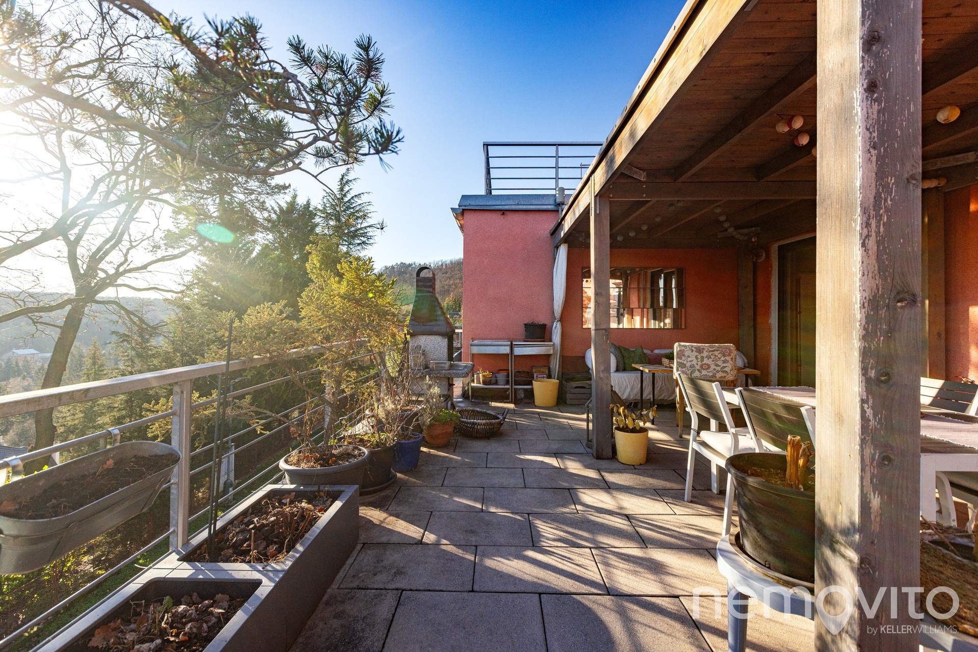 Dominantou bytu je obývák s kuchyní (dohromady 63 m2), který je díky jižní prosklené stěně mimořádně světlý a poskytuje skutečně dech beroucí výhledy do okolí. Díky umístění ve vyšším podlaží je výhled zcela volný, stíní pouze několik stromů. Prostorná rohová kuchyně je zejména v létě přímo spojená s první terasou, která je pohledově zcela otevřená do údolí a zároveň částečně krytá. Terasa je u bytu ještě jedna, a sice na druhou stranu (západ) - nyní je zde umístěna zimní zahrada/sklad.
