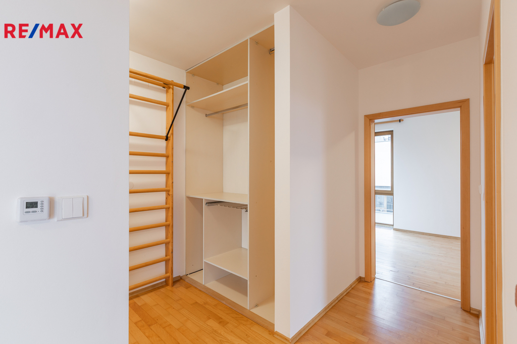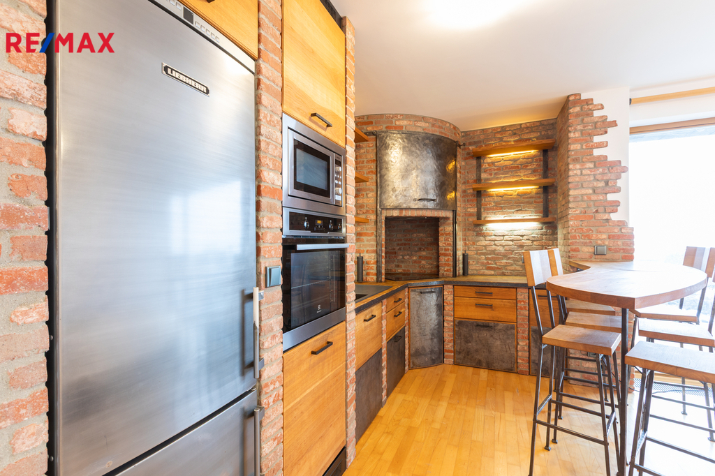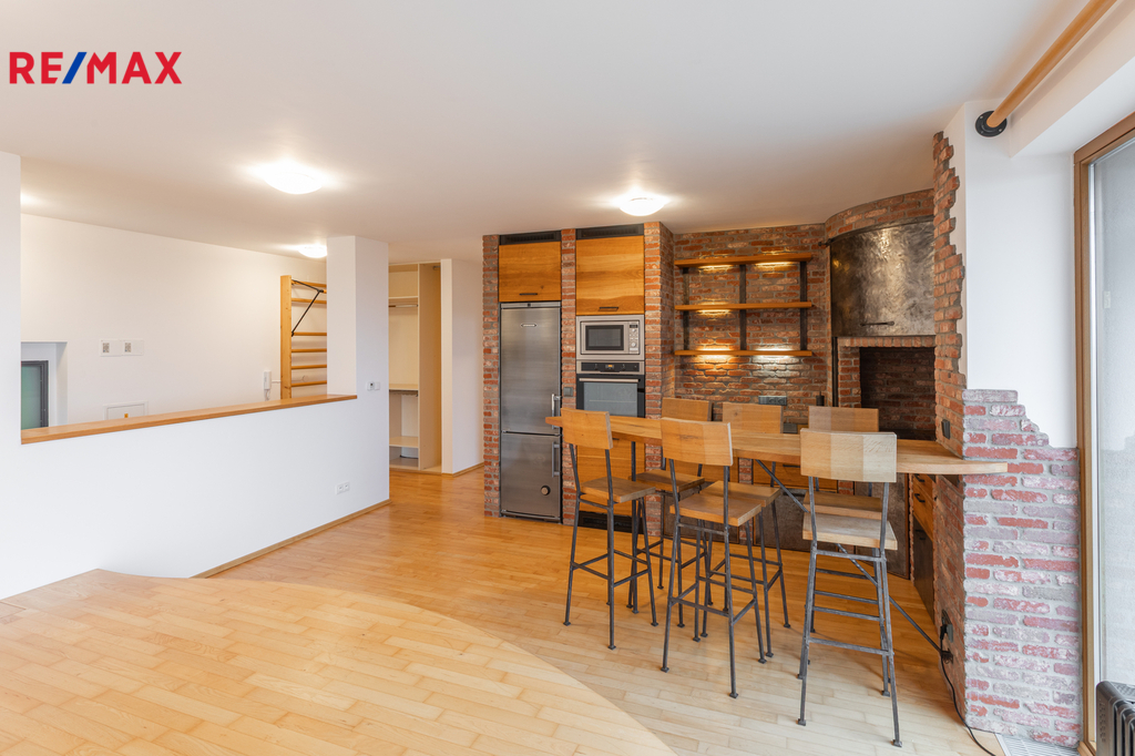 Byt v posledním 3. nadzemním podlaží menšího projektu jen se sedmi dalšími jednotkami v domě je částečně zařízen vestavěným nábytkem a spotřebiči (viz fotografie). Ze vstupní chodby vede několik schodů do otevřeného prostoru kuchyně s obývacím pokojem, krásně prosvětleným velkými okny s výhledem na Prahu, naopak ložnice je orientována do klidného vnitrobloku. Díky velikosti bytu nabízí dispozice i koupelnu s WC a pračkou vybavenou velkým oknem a tedy s denním světlem.