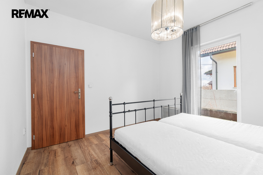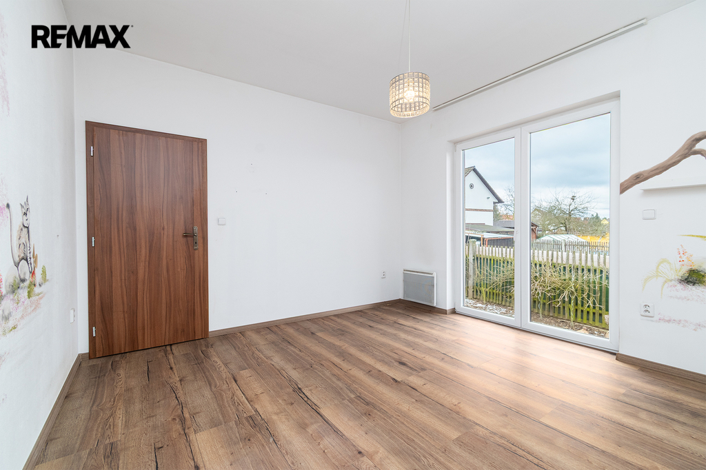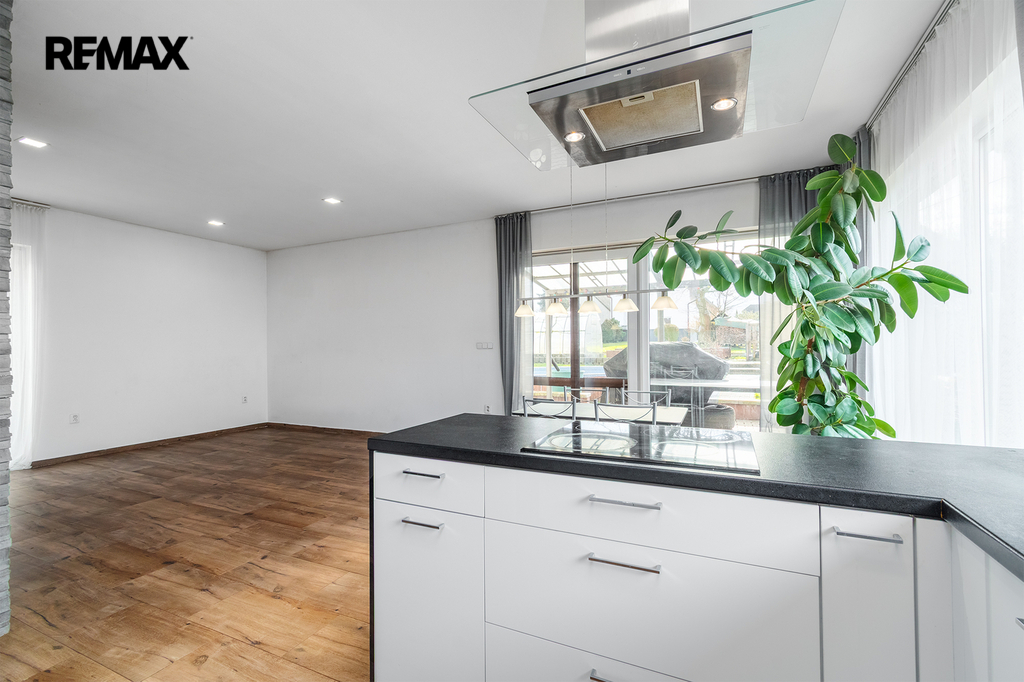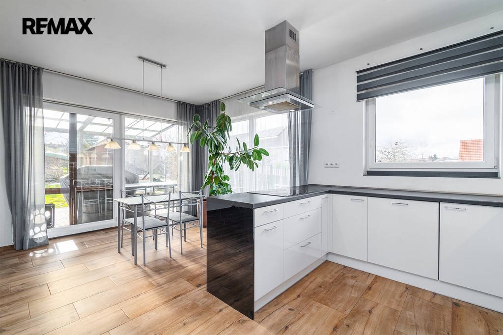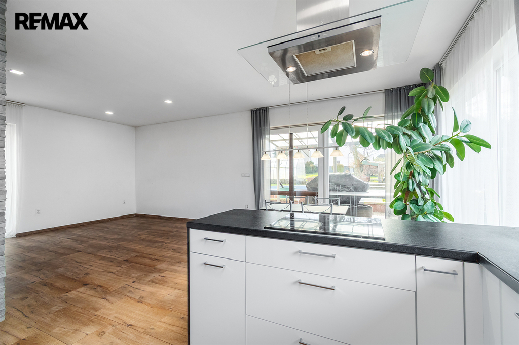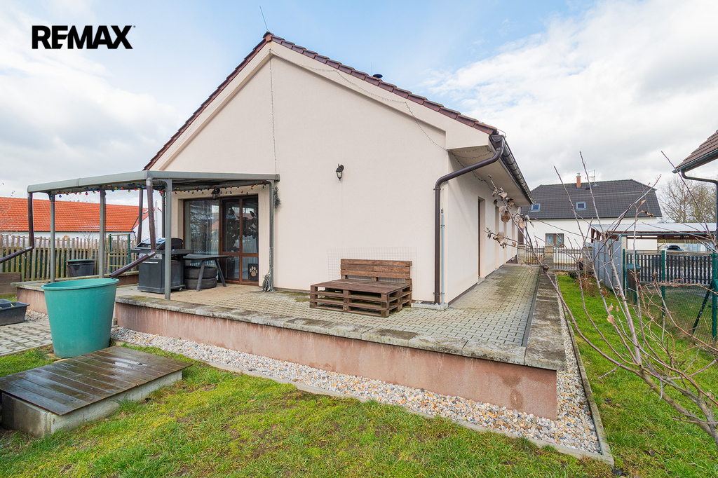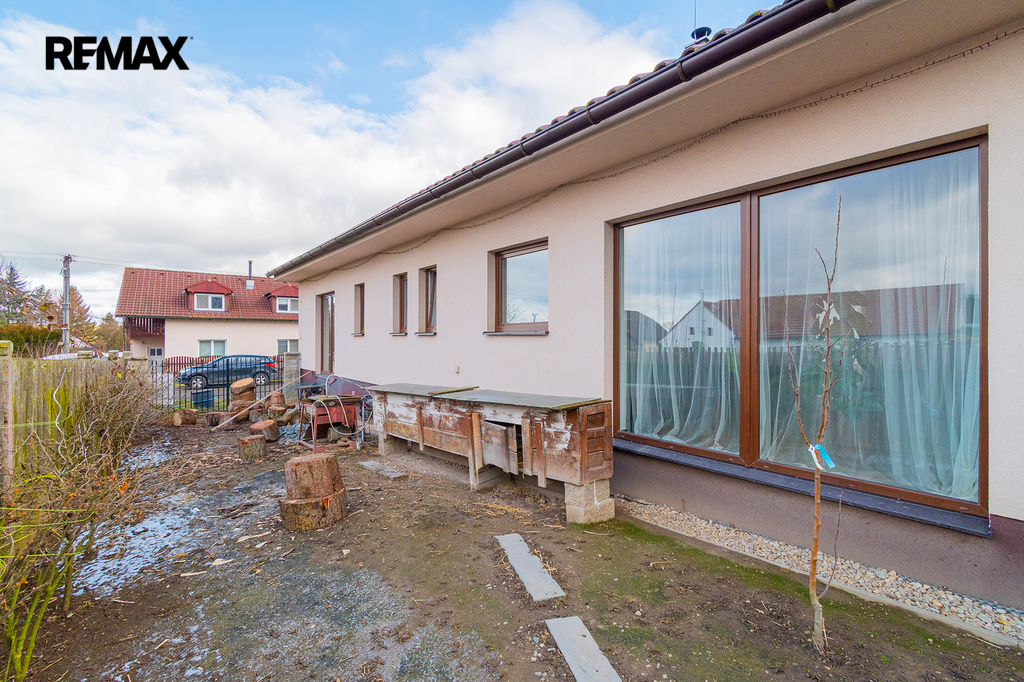 Dispozičně je rozdělena na velkorysý obývací prostor s kuchyňským koutem a se vstupem na zahradu, dále na tři ložnice, koupelnu s WC, samostatné WC, technickou místnost, chodbu a prostornou předsíň.