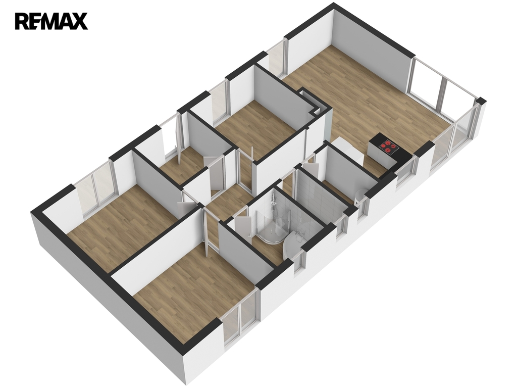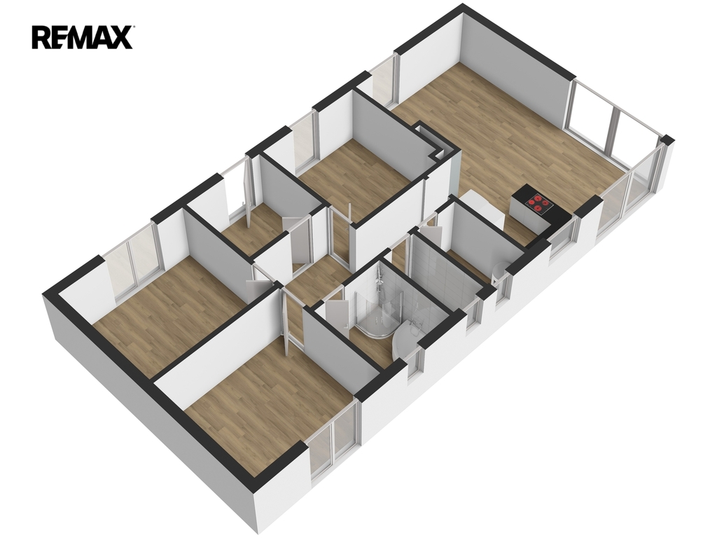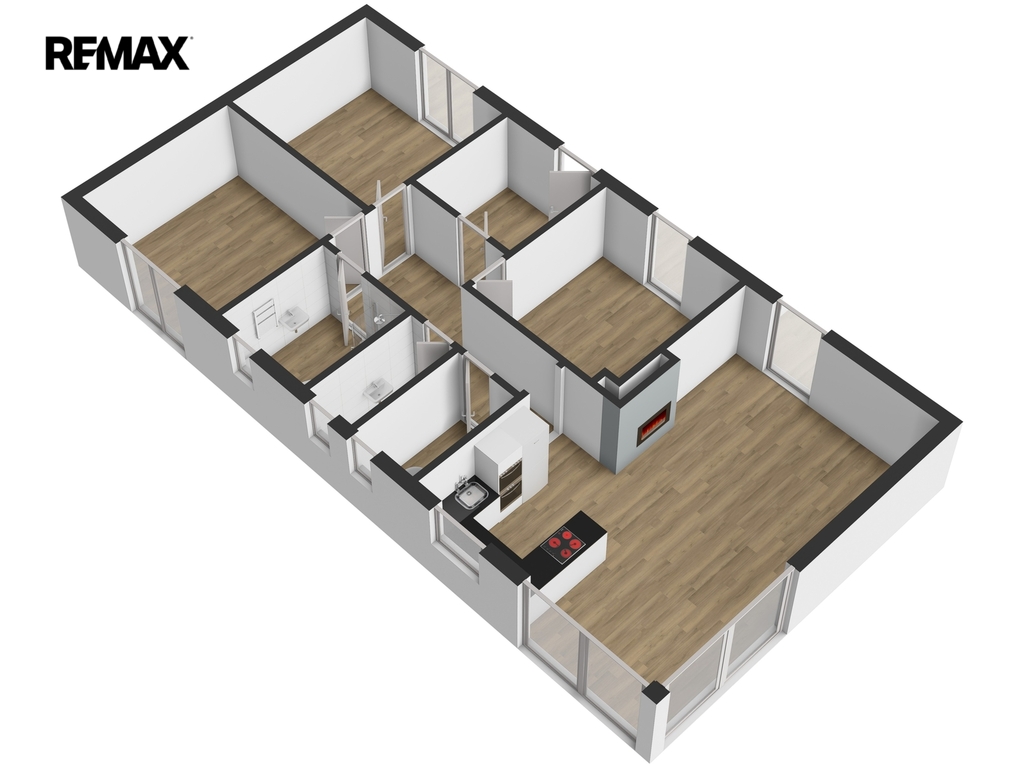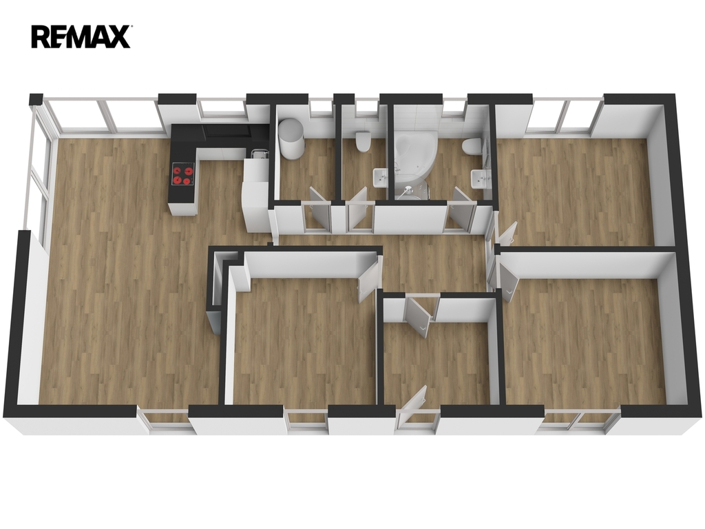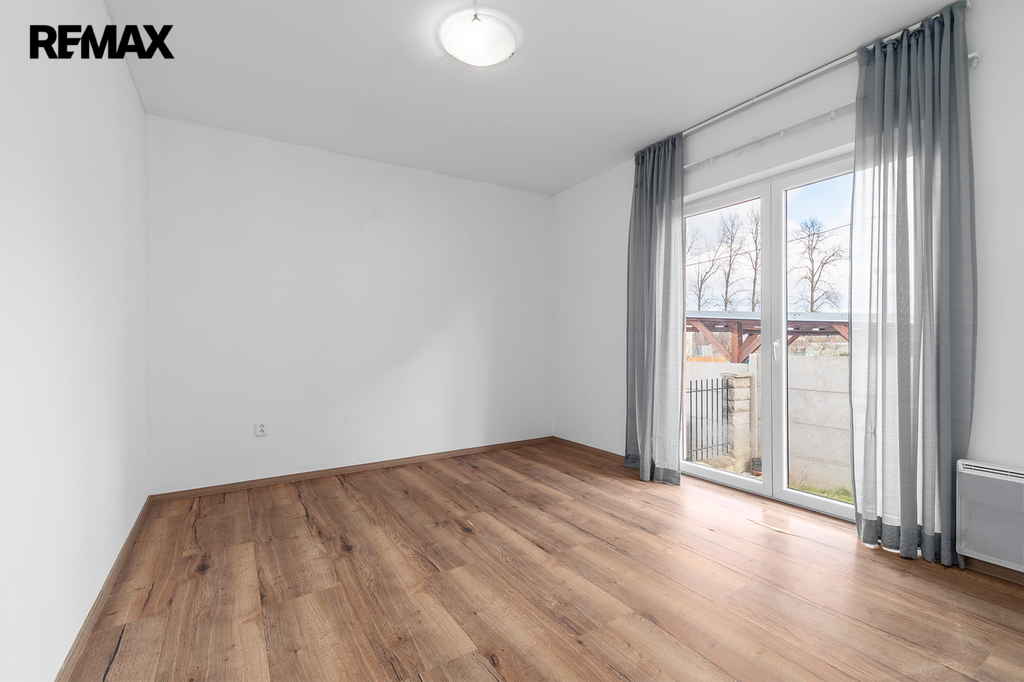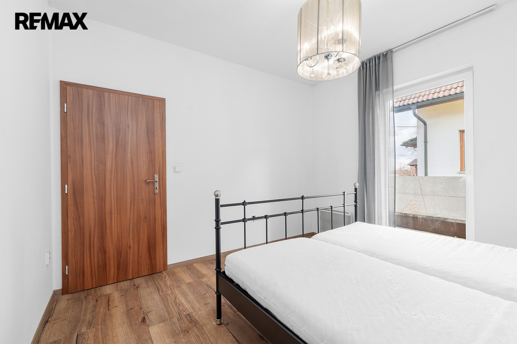 Dispozičně je rozdělena na velkorysý obývací prostor s kuchyňským koutem a se vstupem na zahradu, dále na tři ložnice, koupelnu s WC, samostatné WC, technickou místnost, chodbu a prostornou předsíň.