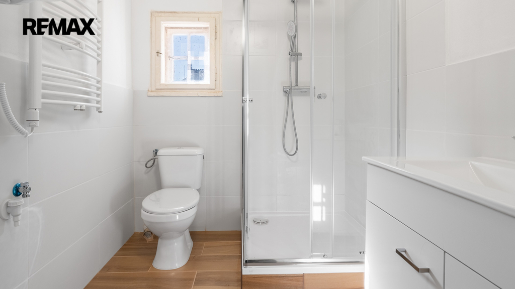 Zvláštností bytu je koupelna, které také prošla modernizací a je umístěná mimo bytovou jednotku, na chodbě domu. Toto řešení může vyhovovat těm, kteří preferují oddělený sanitární prostor mimo hlavní obytnou část.