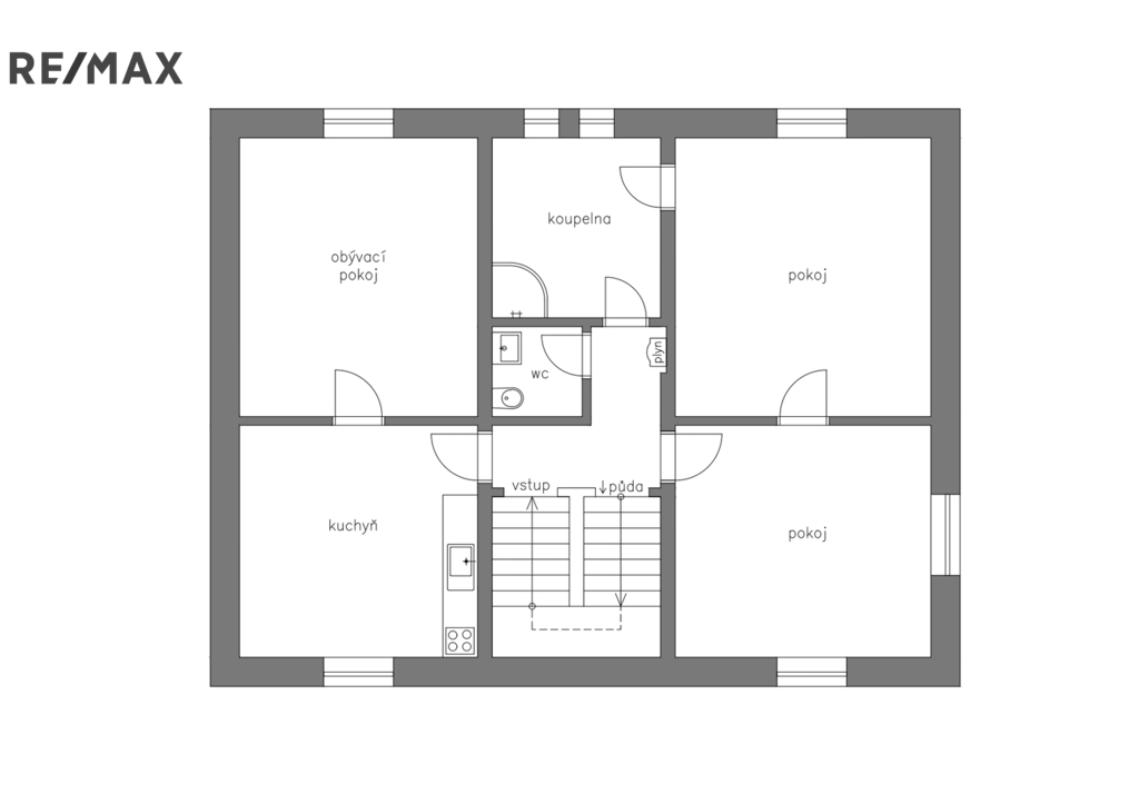 Velkou přidanou hodnotou je celý půdní prostor patřící k bytu. Díky přístupu po schodech je možné po rekonstrukci podkroví výrazně zvětšit obytnou plochu a vytvořit další pokoje.