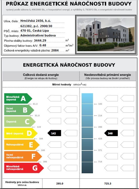 - Ukazatel energetické náročnosti budovy: 142 kWh/m²