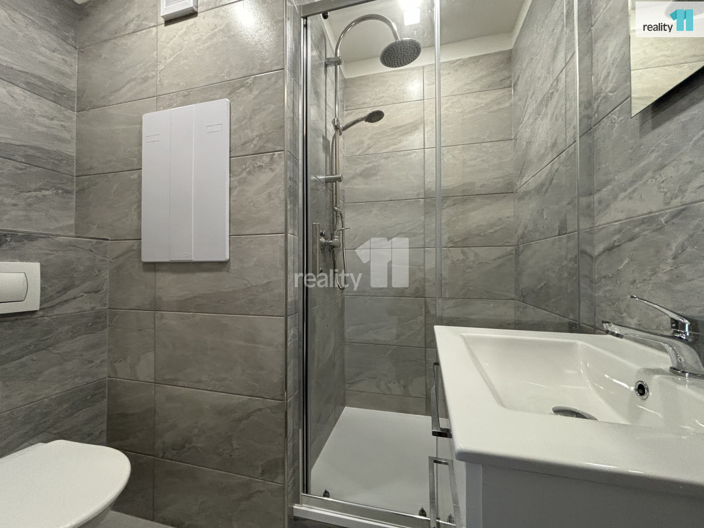 - zděná koupelna se sprchovým koutem, závěsné WC, závěsná umyvadlová skříňka