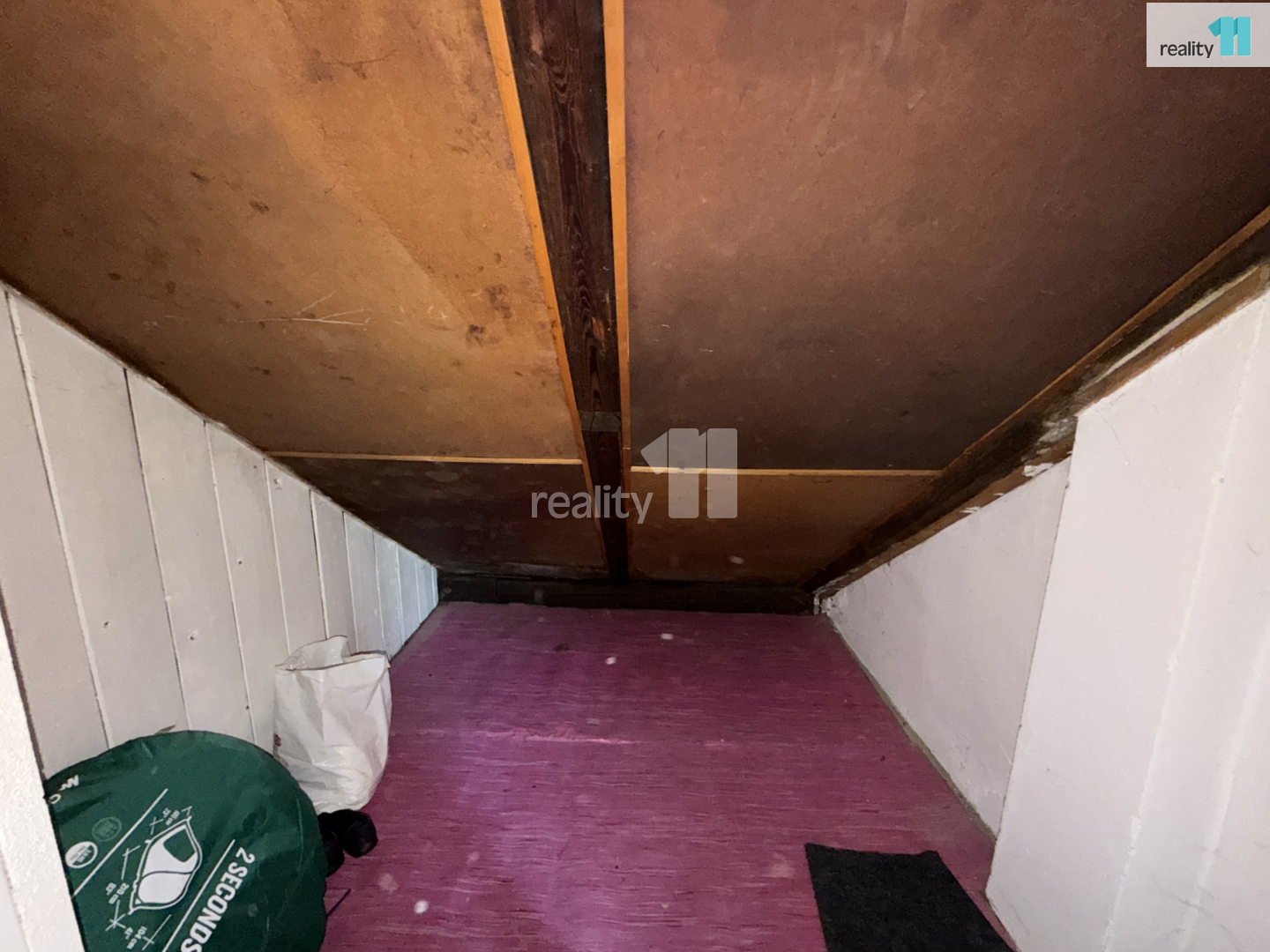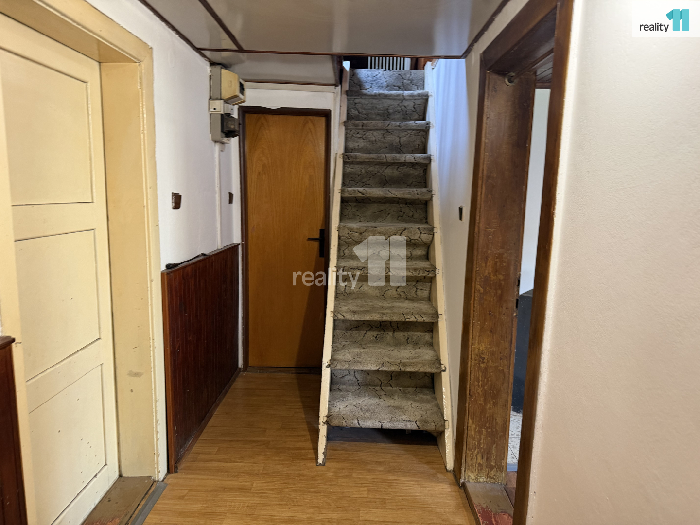 Přízemí: Vstupní chodba, umývárna s WC, obytná místnost s krbem, kuchyň, dřevěné schodiště do podkroví. Částečně nový štuk a výmalba.