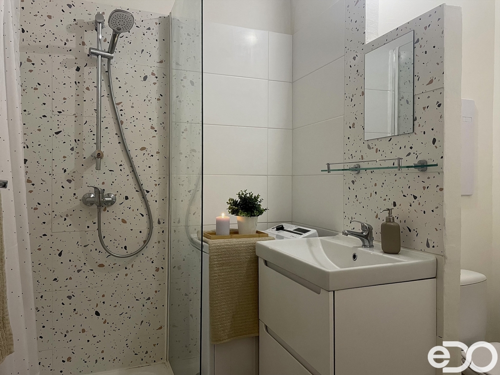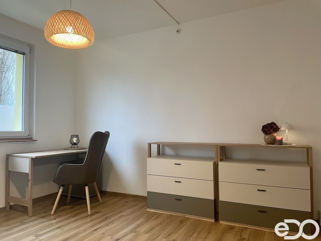 Byt má praktické a jednoduché uspořádání poskytující dostatek soukromí. Dispozice zahrnuje obývací pokoj s pohovkou, úložnými prostory a pracovní kout, samostatnou ložnici se skříní, kompletně vybavenou kuchyni s kuchyňským koutem, koupelnu se sprchovým koutem a WC a prostornou předsíň rovněž s úložnými prostory. V bytě je také možné připojení k internetu. V rámci pronájmu jsou zahrnuty sklep, společný prostor pro kola a sušárna.