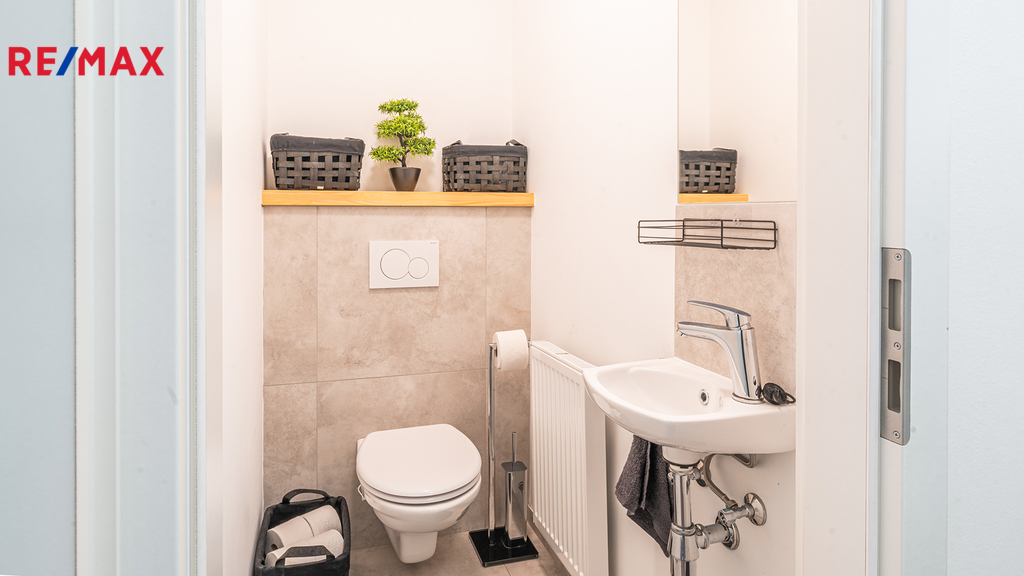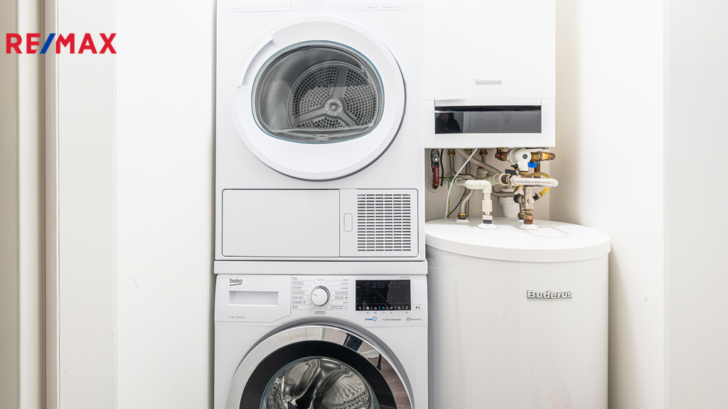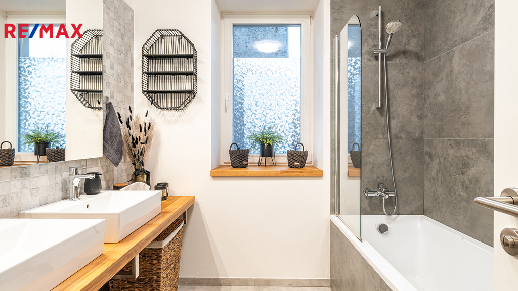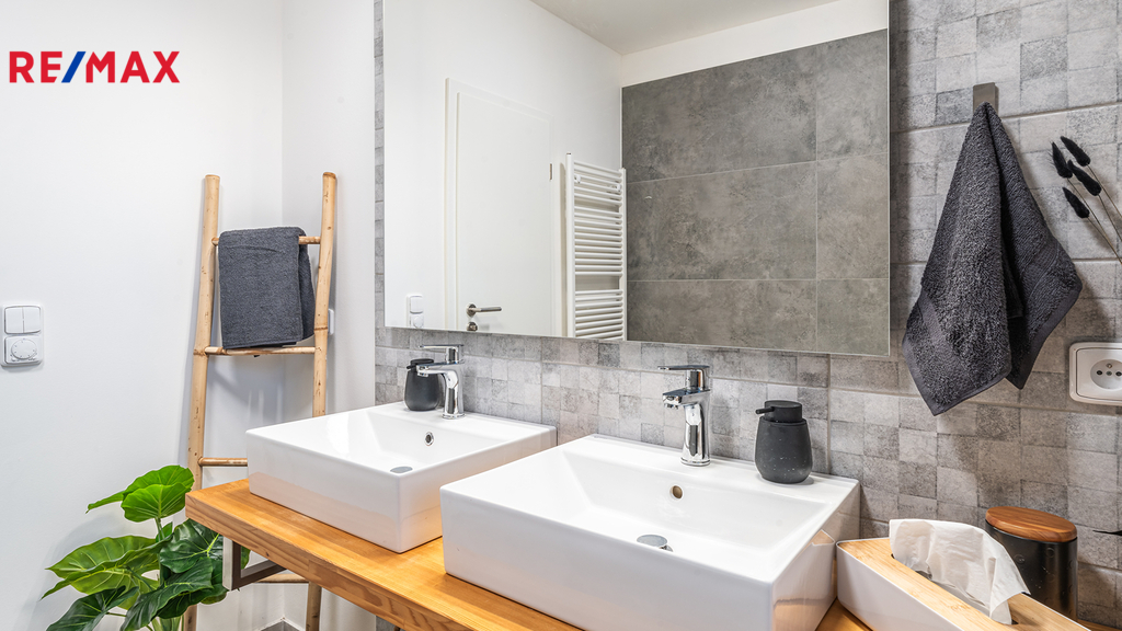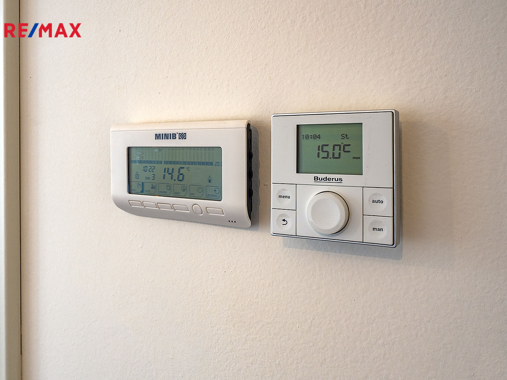 Byt je vybaven vlastním plynovým kotlem BUDERUS Logamax + zásobníkem TUV 120L Logalux, umístěnými v technické místnosti, obojí s možností komfortního automatického ovládání. V koupelně i na toaletě jsou použity velmi kvalitní obklady a dlažby - Quenos grey + Quenos white, stejně jako zařizovací předměty - vana obdélníková Vagnerplast LINOS 170×75 cm + VILMA skleněná vanová zástěna 600x1400mm, 2x umyvadlo SISTEMA 50×42cm, AVICE deska 150x50cm old wood. Koupelna i toaleta mají vedle radiátorů možnost el. podlahového vytápění. V obývacím prostoru je v podlaze umístěn elektrický radiátor pro ohřev vzduchu před francouzskými dveřmi na terasu.