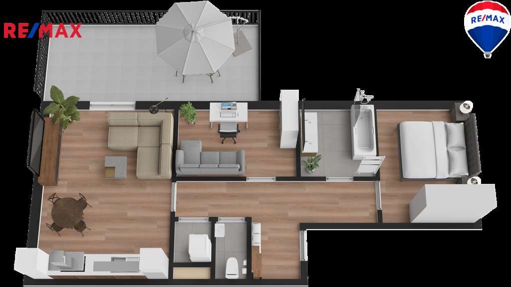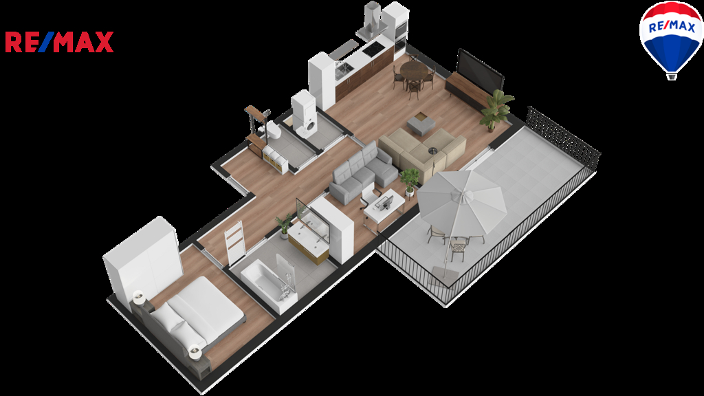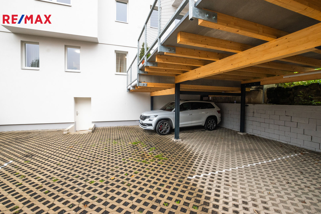 Byt o celkové podlahové ploše 84 m2 (včetně vlastní terasy 23 m2) je situován v 1.NP bytového domu ve vnitrobloku a jeho součástí je i venkovní terasa o velikosti 23 m2 ve výlučném užívání a kryté parkovací stání o výměře 24 m2. Dispoziční řešení bytu je patrné z přiloženého půdorysného schématu a bytem se můžete projít prostřednictvím virtuální prohlídky. Byt je kompletně zařízen moderním nábytkem včetně spotřebičů a disponuje vstupní chodbou, toaletou, technickou místností, obytnou kuchyní, ložnicí, menším pokojem či pracovnou, koupelnou a prostornou terasou. K dispozici je vyhrazené parkovací stání pro 1 osobní automobil ve dvoře a samostatný sklepní prostor.