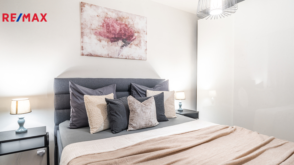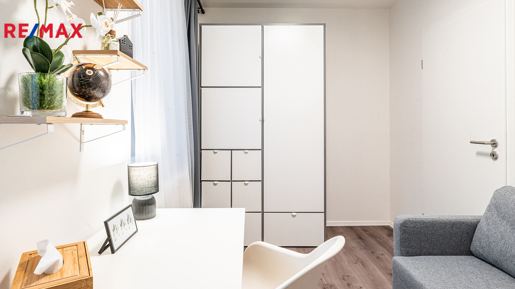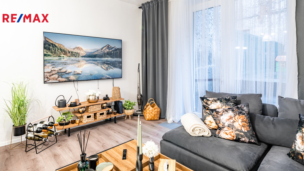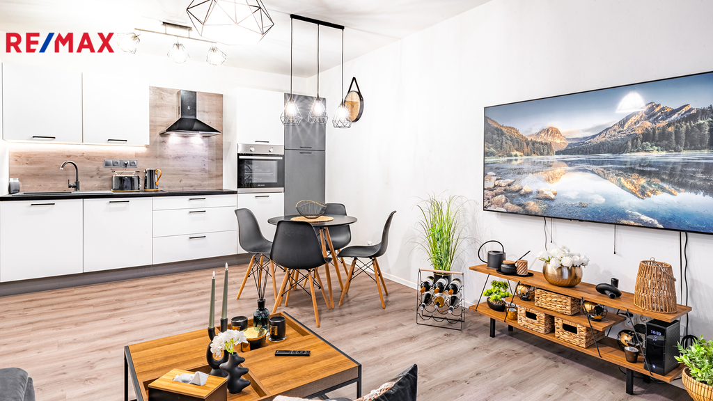 Byt je připraven k okamžitému nastěhování. Součástí vybavení bytu je 65" Smart TV SAMSUNG QE65Q80A, set pračky se sušičkou, tyčový vysavač, moderní úsporná svítidla, interiérové dekorace atd. Kuchyňská linka je v bílém provedení s černými úchytnými lištami, vybavená spotřebiči - pečící el. trouba, indukční varná deska, mikrovlnná trouba, lednice, myčka nádobí, digestoř.