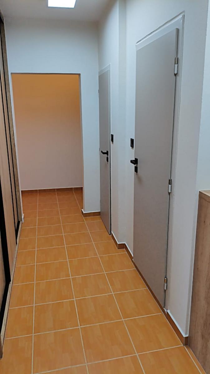 Podlahy vinyl a dlažba. Zděná koupelna s vanou vč. zástěny s umyvadlem a podumyvadlovou skříňkou. Oddělené WC. Vytápění a ohřev vody dálkově s vlastními měřidly. Kuchyňská linka s plynovou varnou deskou, elektrickou troubou, vestavnou mikrovlnnou troubo a myčkou. Vestavná skříň v předsíni, šatní stěna a komoda.