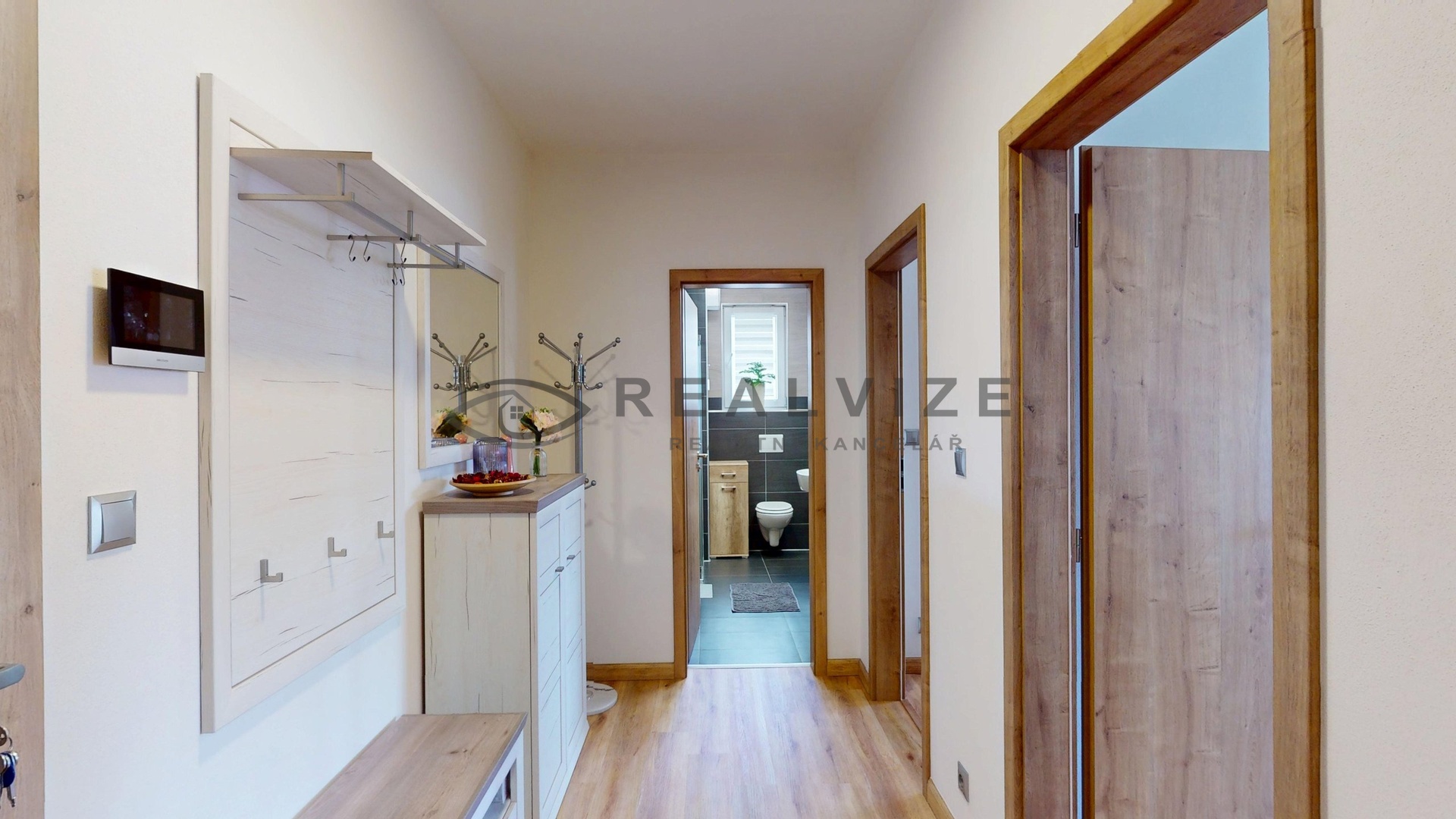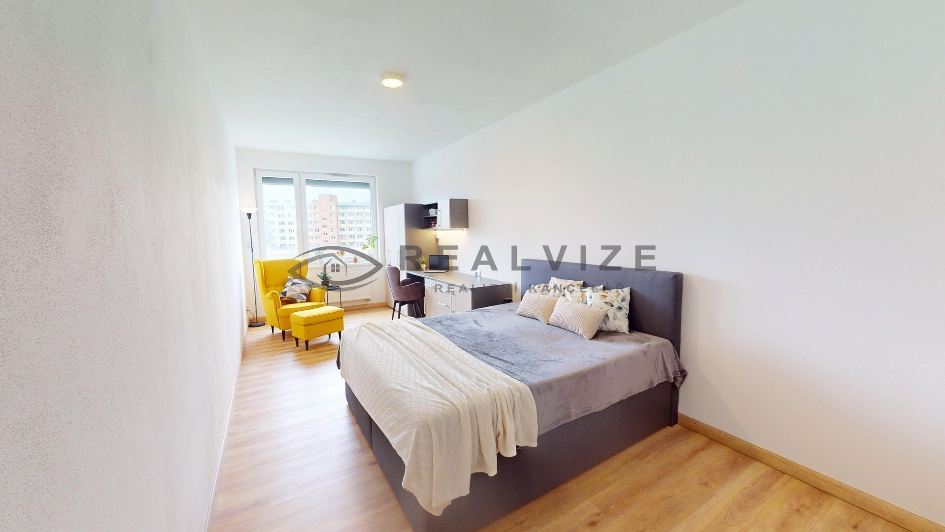 Dispozice bytu tvoří vstupní předsíň (cca 8,6 m²), ze které je samostatný vstup do všech místností. Hlavní obytnou část tvoří obývací pokoj s kuchyňským koutem o výměře cca 34,21 m². Kuchyňská linka je vybavena vestavnými spotřebiči včetně myčky nádobí. Ložnice o velikosti cca 21,85 m² umožňuje kromě klasického zařízení také vytvoření pracovního koutu nebo šatní části. Součástí bytu je koupelna o výměře cca 6,41 m², která je vybavena vanou, dvojumyvadlem, závěsným WC a přípravou pro pračku. Velkým benefitem je okno v koupelně, díky kterému je možné přirozené větrání.