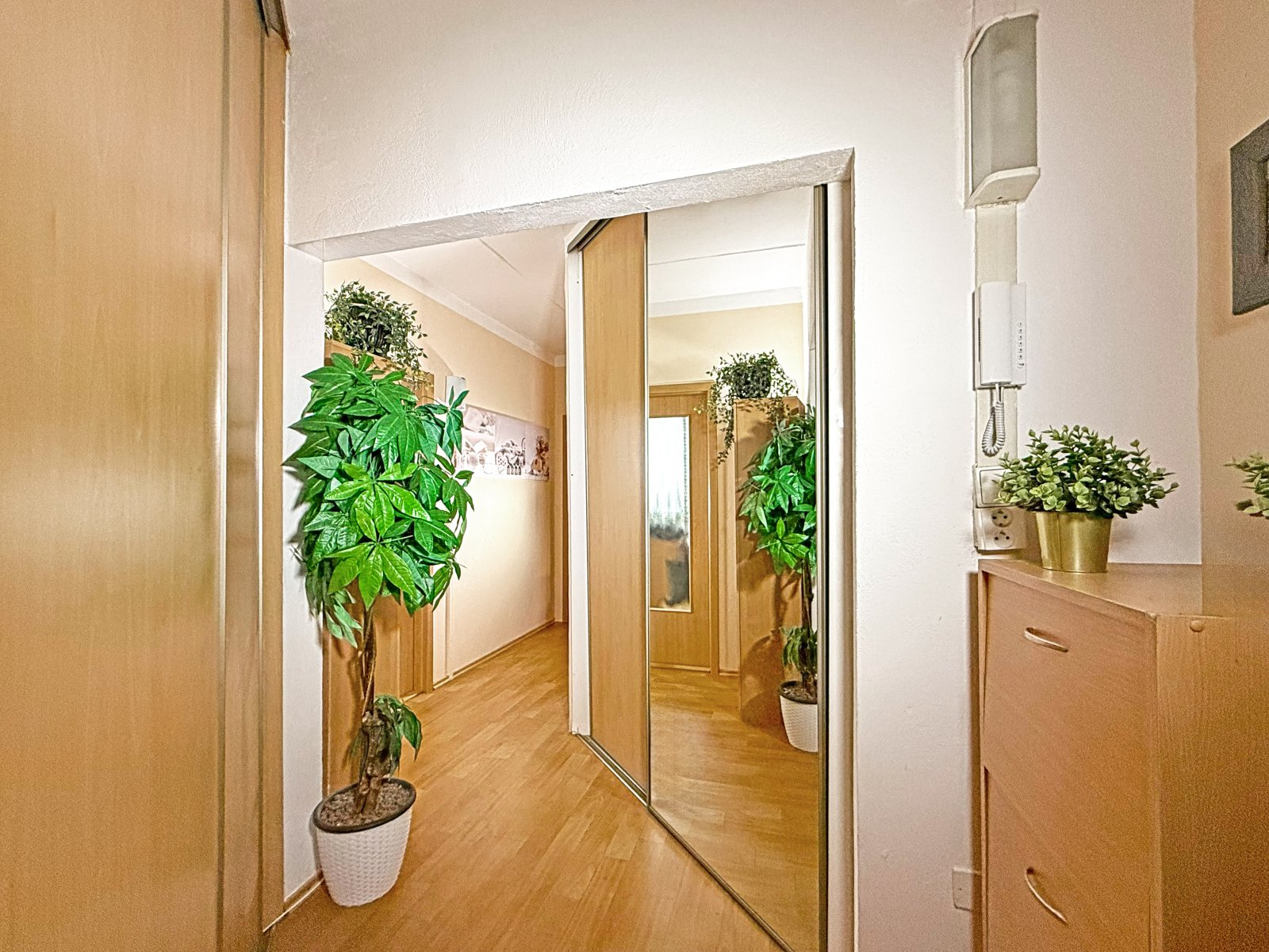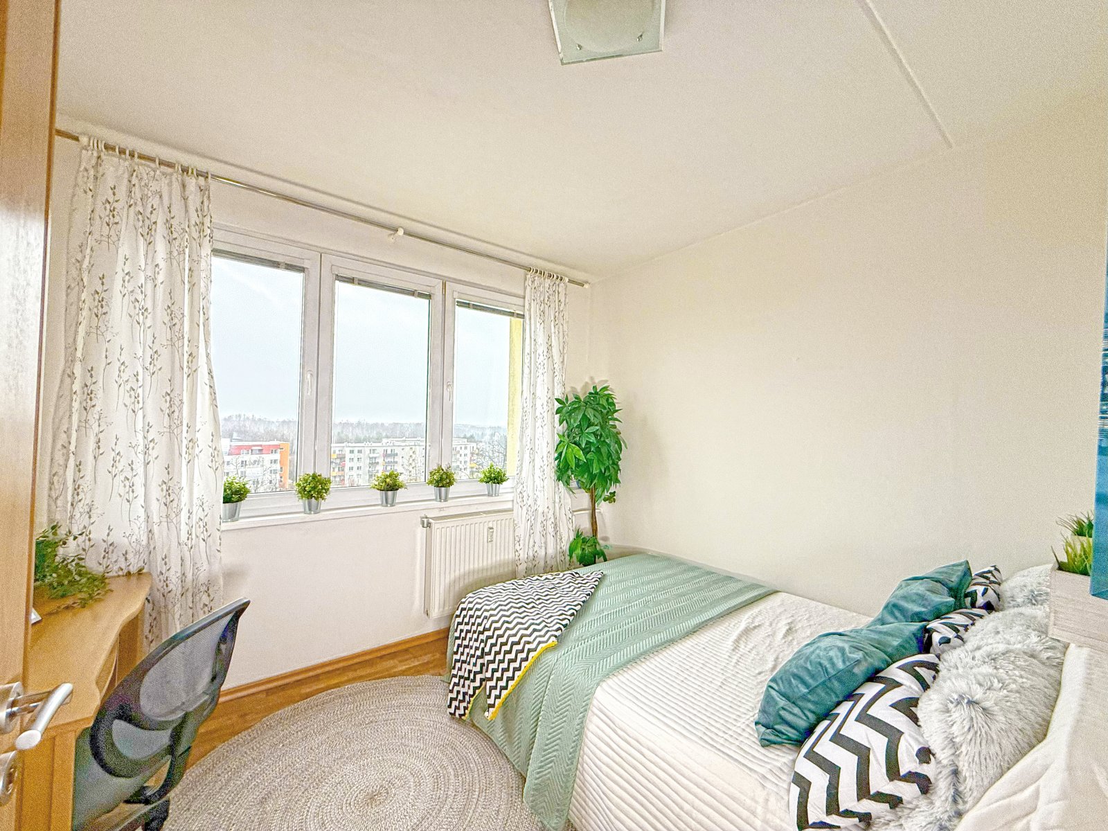 Ze vstupní chodby ve tvaru „L“ je samostatný vstup do všech místností. Dominantou bytu je světlý obývací pokoj s výstupem na balkon a kuchyňským koutem. V kuchyňské části je prostorná kuchyňská linka vybavená vestavěnými spotřebiči – sklokeramickou varnou deskou, elektrickou troubou, myčkou, digestoří a lednicí s mrazákem. Dále je v bytě ložnice, samostatná toaleta a koupelna se sprchovým koutem. Podlahové krytiny v bytě tvoří PVC, koberec a dlažba.