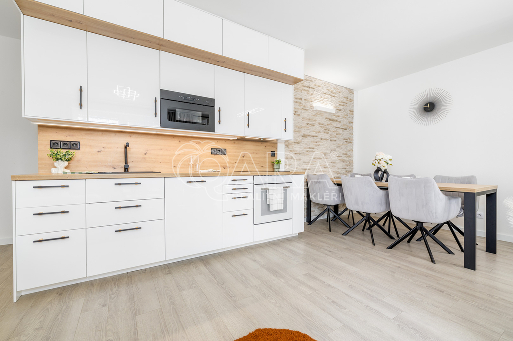 Byt prošel kompletní designovou úpravou a rekonstrukcí koupelny a disponuje vstupní chodbou, praktickou spíží, prostorným obývacím pokojem s moderní kuchyní, jídelním koutem a pracovním prostorem, ložnicí, šatnou a koupelnou s WC. Dominantou bytu je velká terasa o výměře 52 m² orientovaná na východ s možností umístění posezení, vířivky či sušení prádla. Z obou hlavních místností je přímý výstup na terasu. Součástí je také kolárna sdílená pouze se dvěma dalšími byty.
