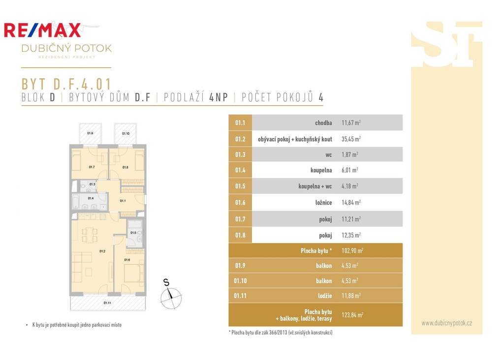 Cena je včetně DPH a její součástí je i sklep (2,1 m2). K bytu je potřeba koupit parkovací stání v podzemní garáži.