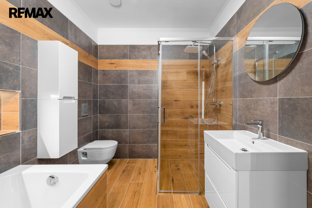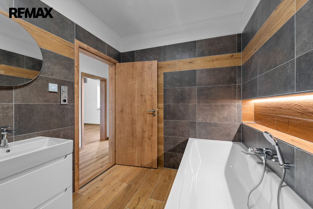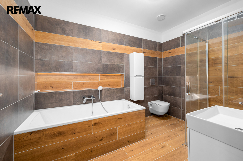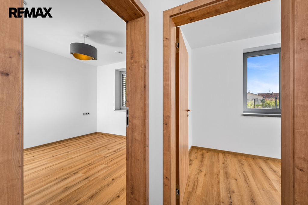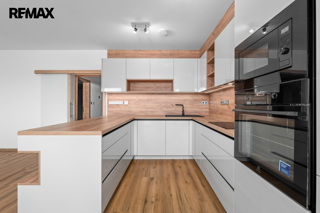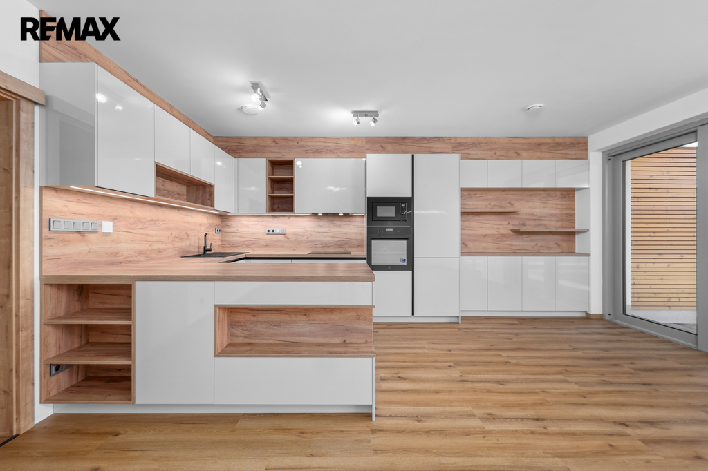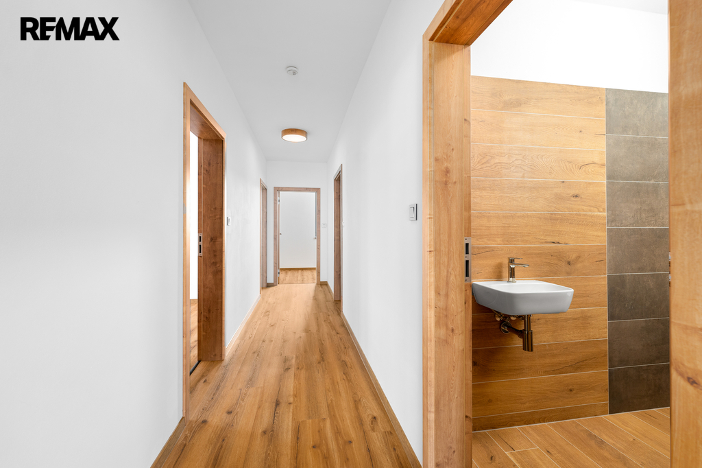 Dispozičně je byt řešen jako 4+kk, kde najdete částečně vybavený obývací pokoj s kvalitní, kompletně vybavenou, kuchyňskou linkou a vstupem na prostornou terasu, tři samostatné pokoje, prostornou komoru, technickou místnost s přípojkou na pračku, koupelnu s WC, vanou i sprchovým koutem a druhé samostatné WC. Půdorys a výměry místností najdete ve fotogalerii. V celé jednotce jsou na podlaze kvalitní dlažby a lepený vinyl, bezfalcové vnitřní dveře Sapeli a LED osvětlení. Okna plastová s trojsklem.