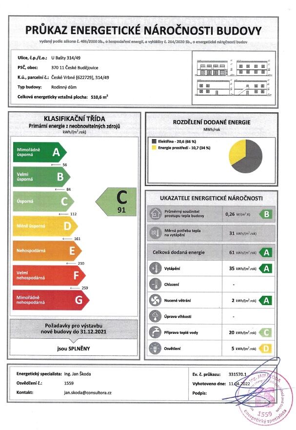 - Ukazatel energetické náročnosti budovy: 91 kWh/m²