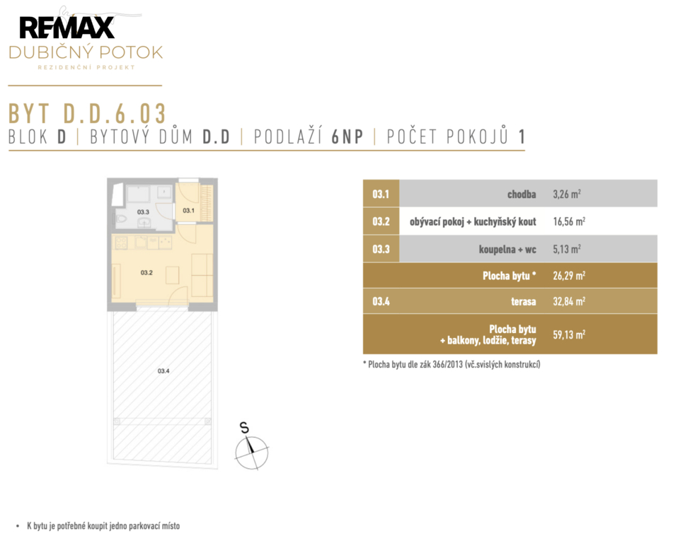 Nabízíme bytovou jednotku D.D.6.03 o dispozici 1+kk s celkovou výměrou 59,13 m2. Nadchne vás svým komfortem a luxusním životním stylem. Předností bytové jednotky je terasa o výměře 32,84 m2.