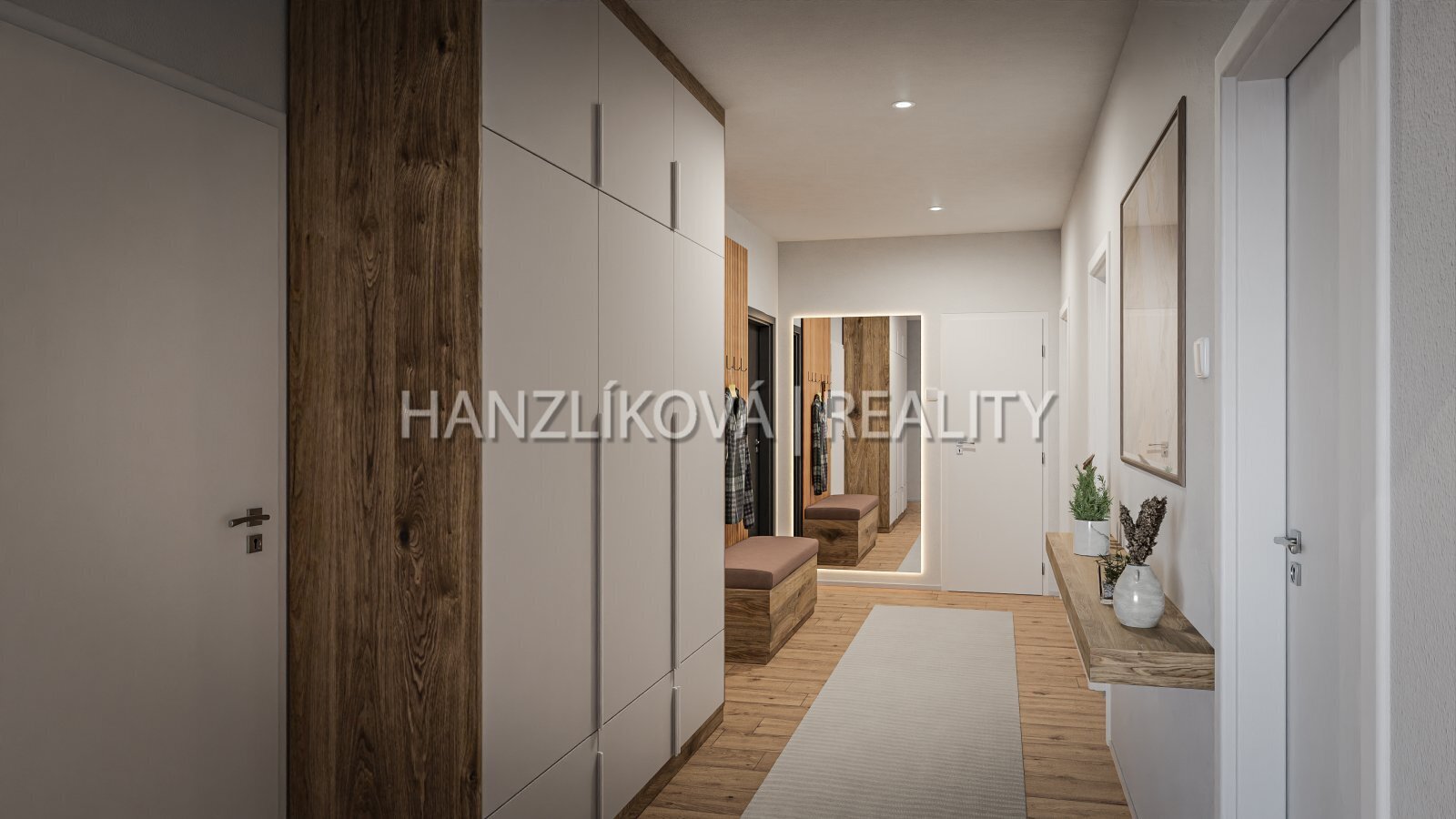 - prostorné chodby, která má dostatek místa pro vestavné skříně a úložné prostory, koupelny s vanou, sprchovým koutem, toaletou, místem na pračku a oknem, samostatné toalety, hlavní obytné části s kuchyňským koutem a jídelnou, dětského pokoje a ložnice. Součástí bytu je balkon o výměře 22,57 m2 a sklepní kóje umístěná v suterénu domu.