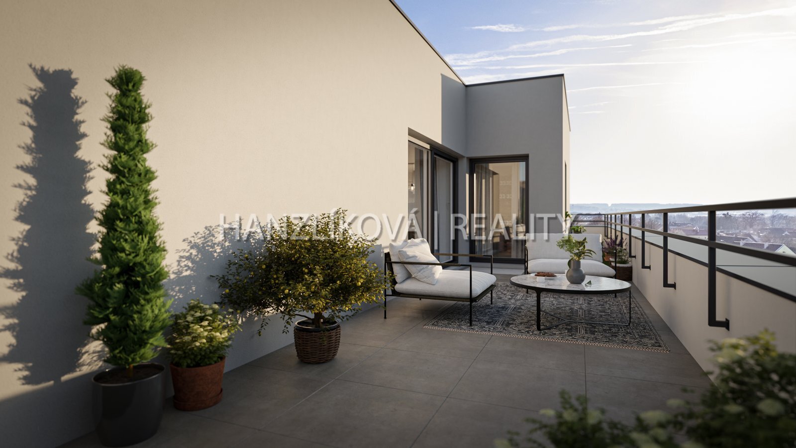 Byt je orientovaný na západ, má prostornou terasu, která se rozprostírá po celé délce bytu a je přístupná ze všech obytných místností. Byt o výměře 103,87 m2 se skládá z těchto místností :