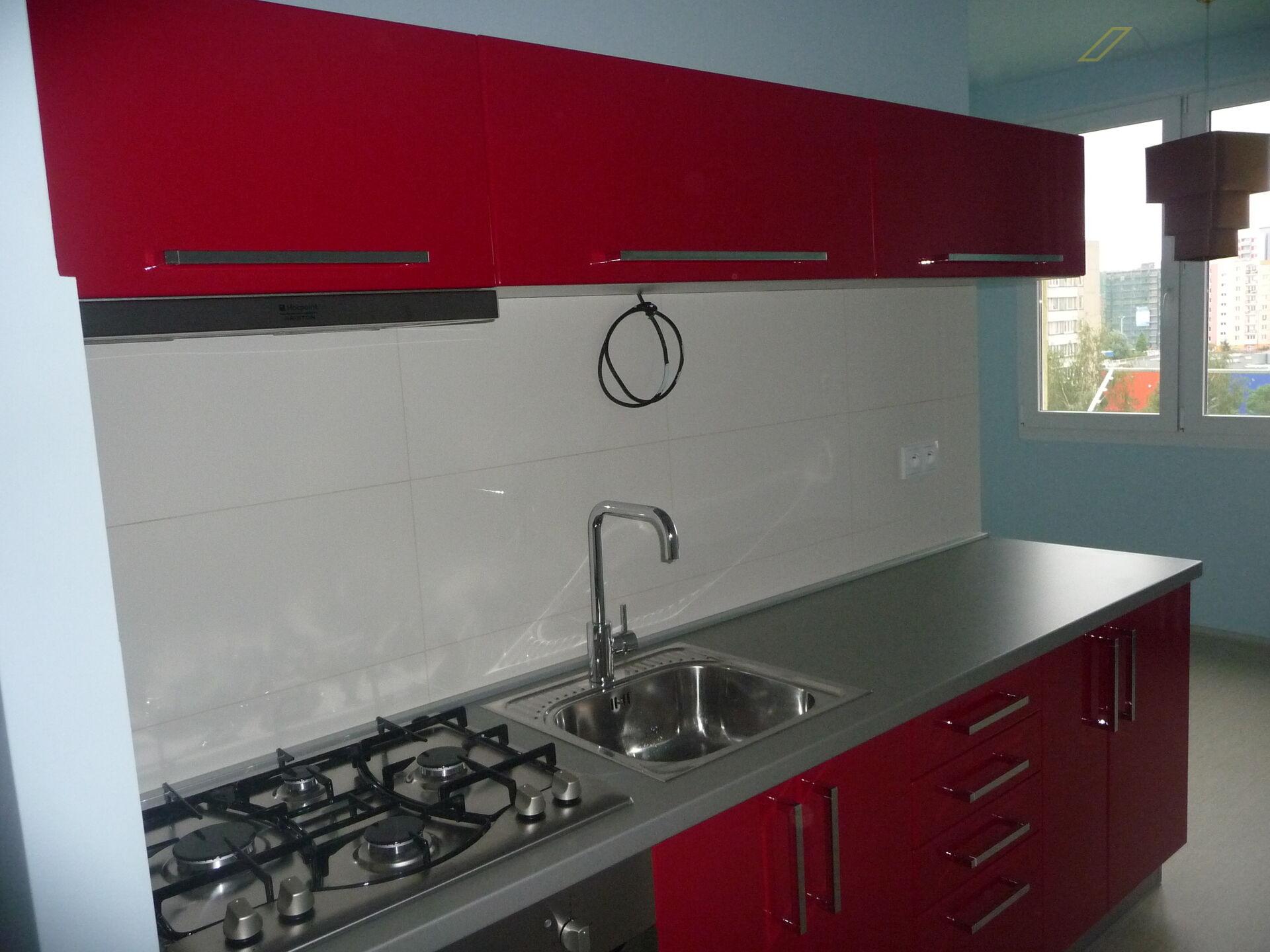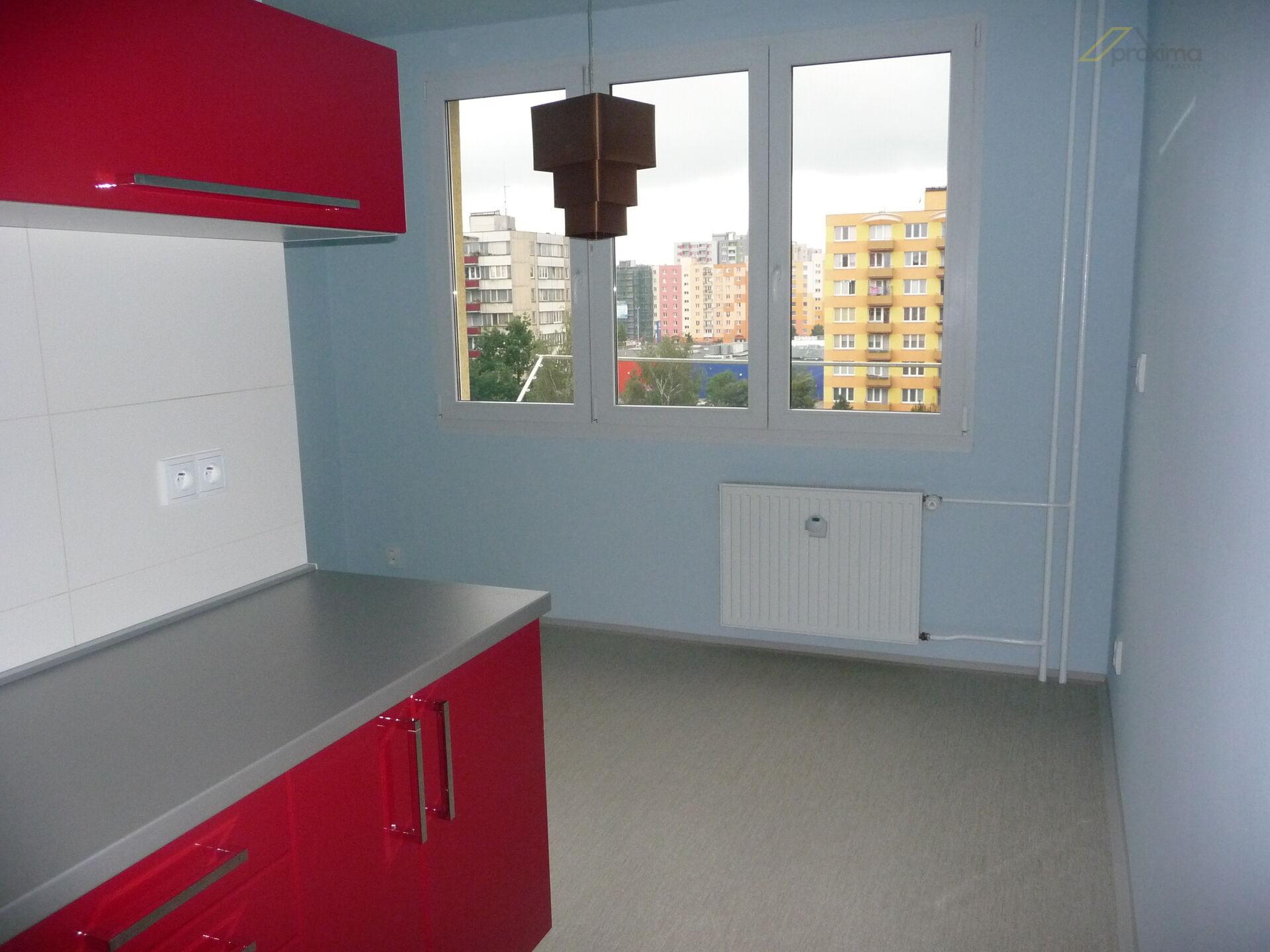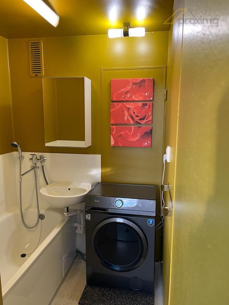 Kuchyňská linka je vybavena spotřebiči a byt se prodává včetně vybavení, jako je nová lednice, pračka a osvětlení.