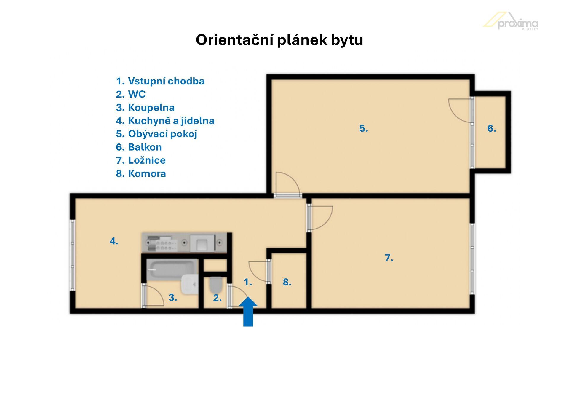 Byt prošel rekonstrukcí a je připraven k okamžitému nastěhování bez nutnosti dalších investic. Dispozice nabízí prakticky řešené, neprůchozí pokoje – ložnici, obývací pokoj a kuchyni s jídelním koutem. Součástí je také koupelna, samostatné WC a prostorná komora, která poskytuje dostatek úložného prostoru.