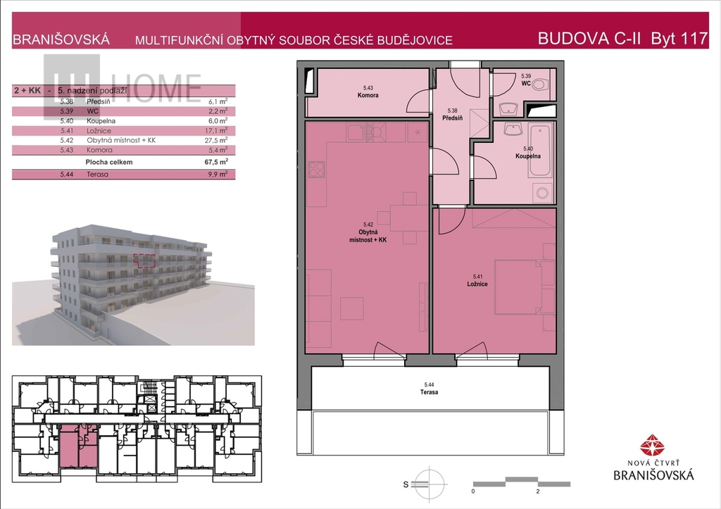 Nabízíme k prodeji moderní a nadstandardně prostorný byt 2+kk o celkové ploše 67,50 m², který je doplněn o balkon 9,90 m². Byt se nachází v 5. podlaží nového rezidenčního projektu Nová čtvrť Branišovská a poskytuje komfortní a funkční bydlení vhodné pro jednotlivce, pár nebo jako investici.
