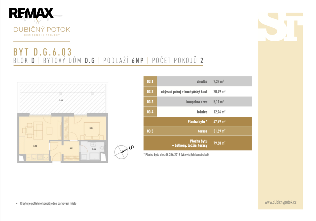 Nabízíme ke koupi prakticky řešenou dispozici 2+kk (označení D.G.6.03) v projektu Dubičný potok. Byt o výměře 47.99 m² se nachází v 6. nadzemním podlaží. Jeho velkou předností je prostorná terasa o výměře 31,69 m², která nabízí velkorysý prostor pro odpočinek venku. Byt je připraven k okamžitému nastěhování.