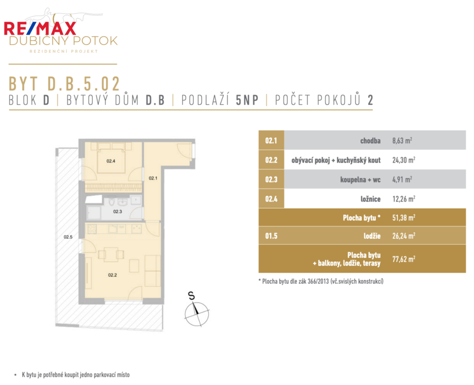 Nabízíme exkluzivní nabídku bytové jednotky D.B.5.02 o dispozici 2+kk o celkové výměře 77,62 m2 vás nadchne svým komfortem a luxusním životním stylem. Byt je připraven k okamžitému nastěhování.