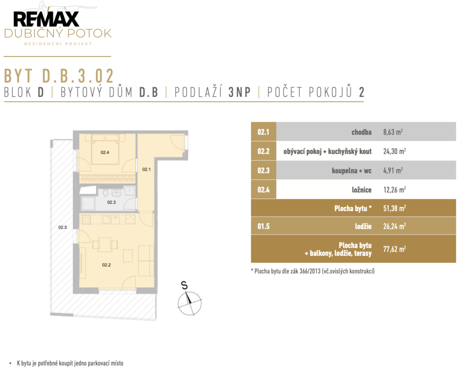 Nabízíme exkluzivní nabídku bytové jednotky D.B.3.02 o dispozici 2+kk o celkové výměře 77,62 m2 vás nadchne svým komfortem a luxusním životním stylem. Byt je připraven k okamžitému nastěhování.