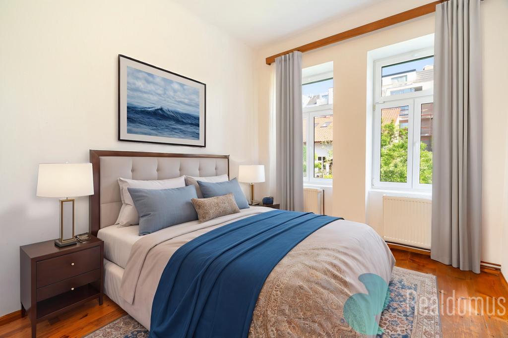 Byt disponuje prostorným obývacím pokojem orientovaným na jih, ložnicí a dětským pokojem situovanými na severní stranu s výhledem do zahrady. Kuchyně je samostatná, dále koupelna s WC. Kuchyňská linka je určena k rekonstrukci. Na podlahách jsou původní dřevěné parkety, které lze krásně zrenovovat, a vysoké stropy dodávají bytu vzdušnost a eleganci. Vytápění zajišťuje úsporný kondenzační plynový kotel. K bytu dále náleží sklep o výměře 10 m2.
