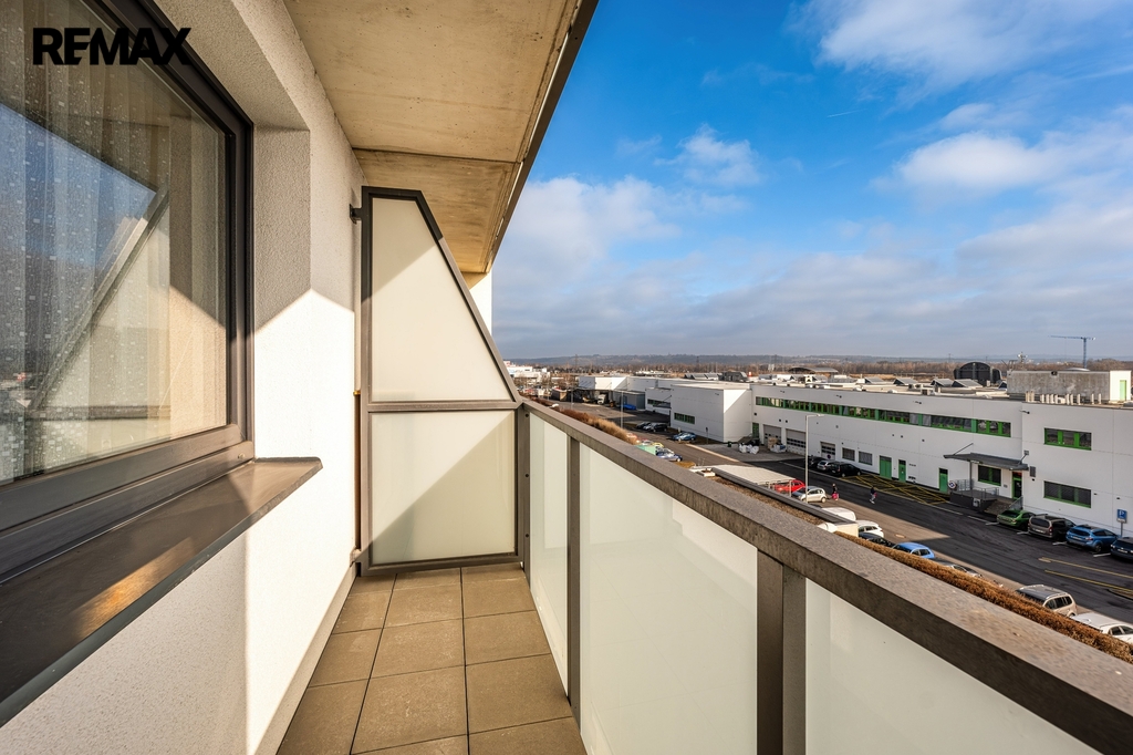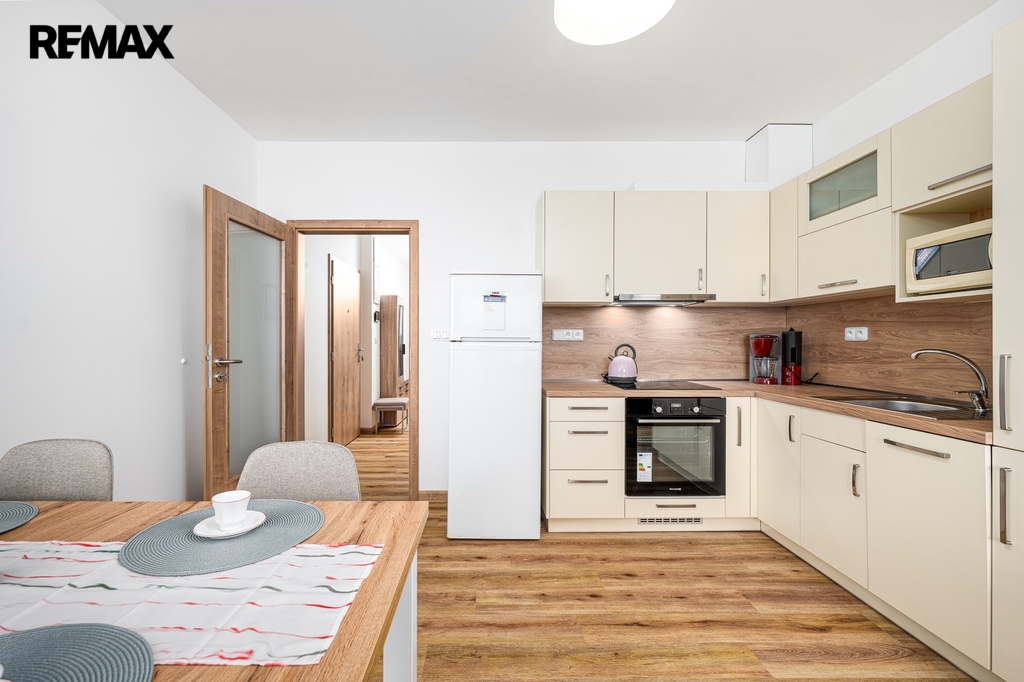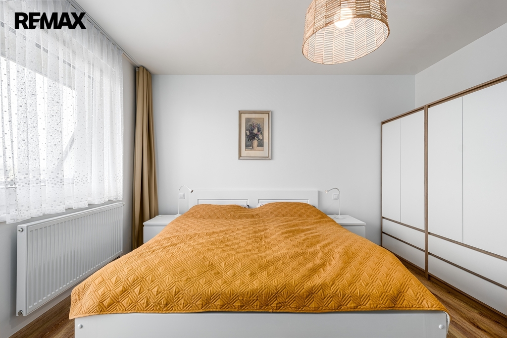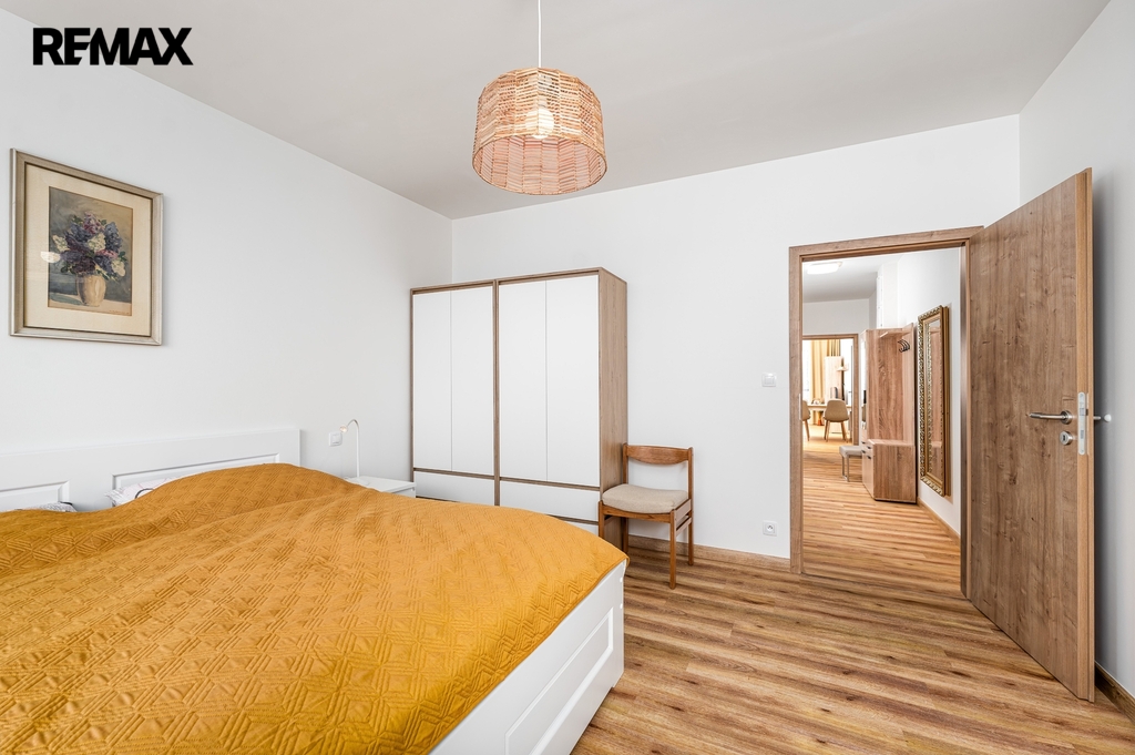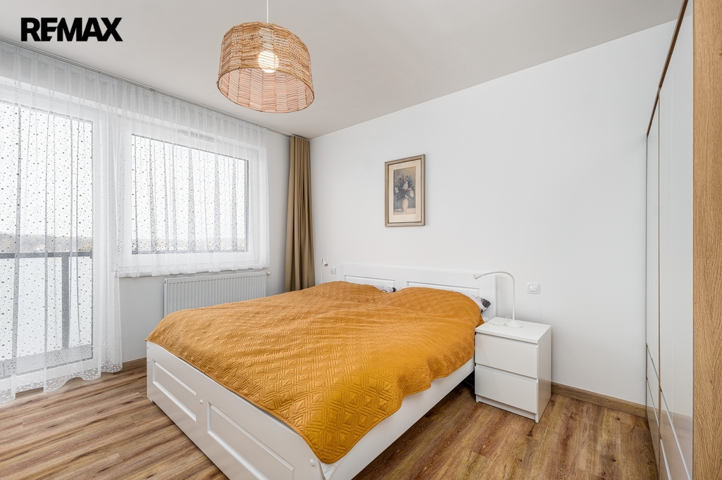 Dispozice bytu (podlahová plocha 64,3 m2) sestává z prostorné vstupní chodby, východně orientovaného obývacího pokoje s kuchyňským koutem (nová kuchyňská linka kompletně vybavena spotřebiči – varná deska + trouba, myčka, lednice) a přímým vstupem na balkon (4,3 m2), dalšího samostatného pokoje (ložnice) se západním výhledem a vstupem na další balkón (4,3 m2), komory (šatna, technická místnost), koupelny se sprchovým koutem, umyvadlem a samostatného WC.