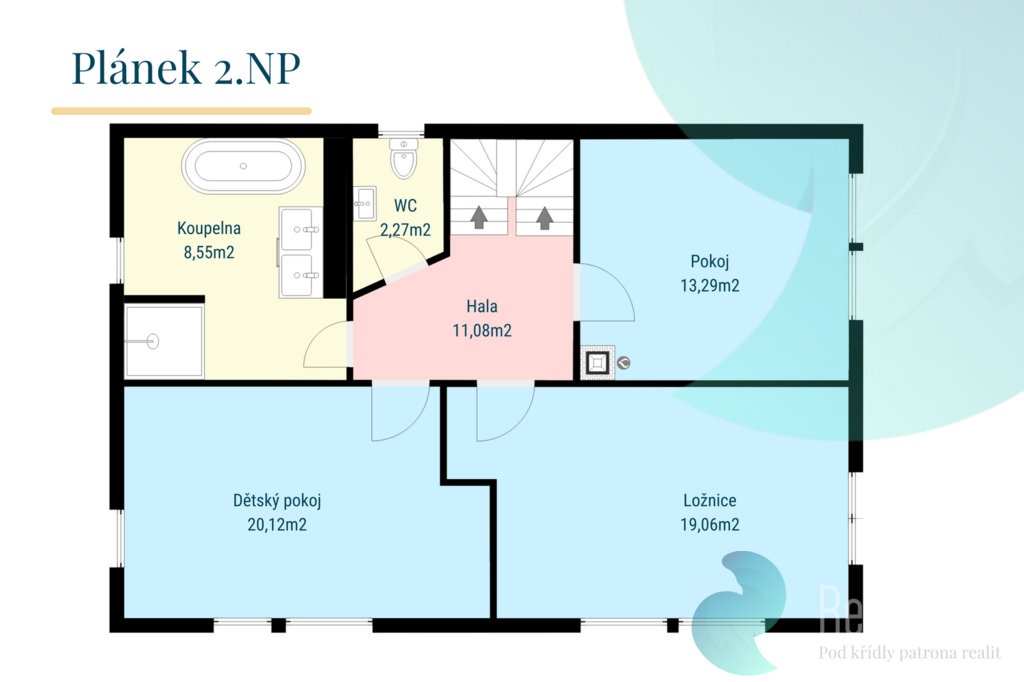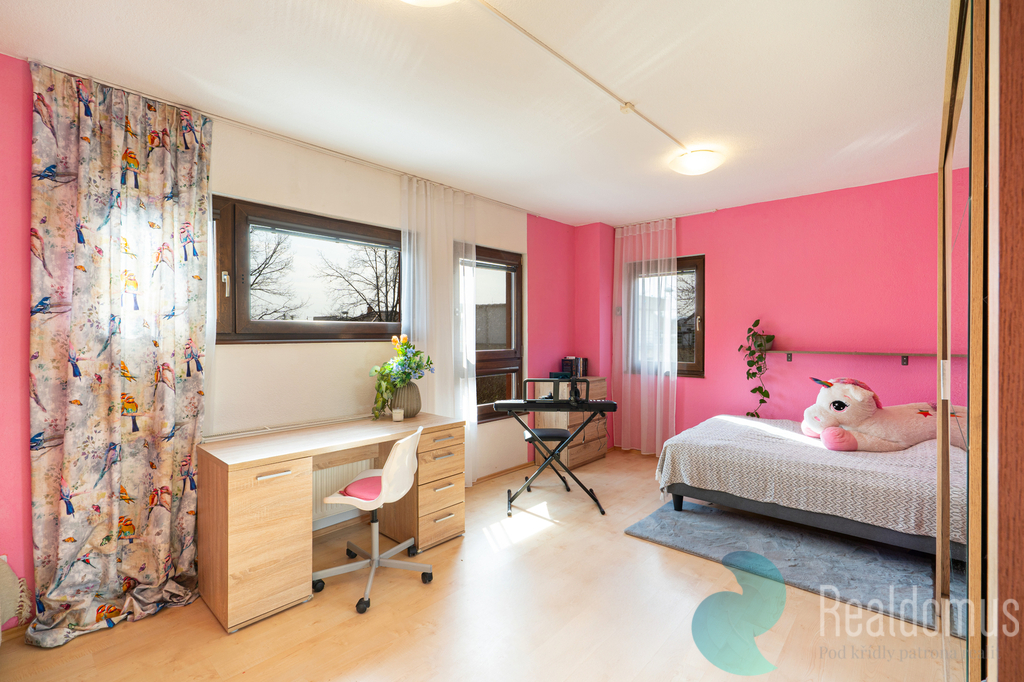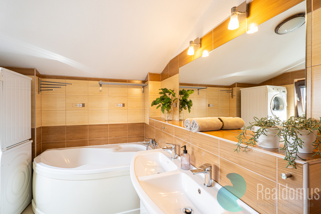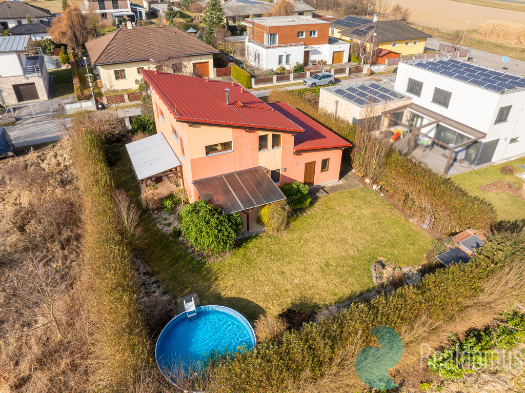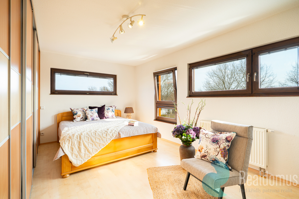 Dům o dispozici 5+kk je díky velkým oknům a přívětivé orientaci prosvětlený a vzdušný a nabízí dostatek prostoru i pro větší rodinu. V přízemí se nachází hlavní obytný prostor, který tvoří spojení prostorné kuchyně (17,70 m²), haly s jídelnou (16,07 m²) a obývacího pokoje s kamny (17,03 m²). Dále zde najdeme pokoj/pracovnu 10,77 m², koupelnu s toaletou (3,01 m²), komoru 2,27 m² a zádveří (3,29 m²). Podkroví tvoří odpočinkovou část domu, je zde hala 11,08 m² a tři samostatné neprůchozí pokoje (13,29 m², 19,06 m², 20,12 m²), dále koupelna s vanou a sprchou (8,55 m²) a samostatné WC (2,27 m²).