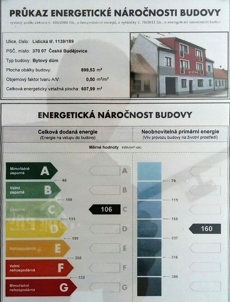 - Ukazatel energetické náročnosti budovy: 106 kWh/m²