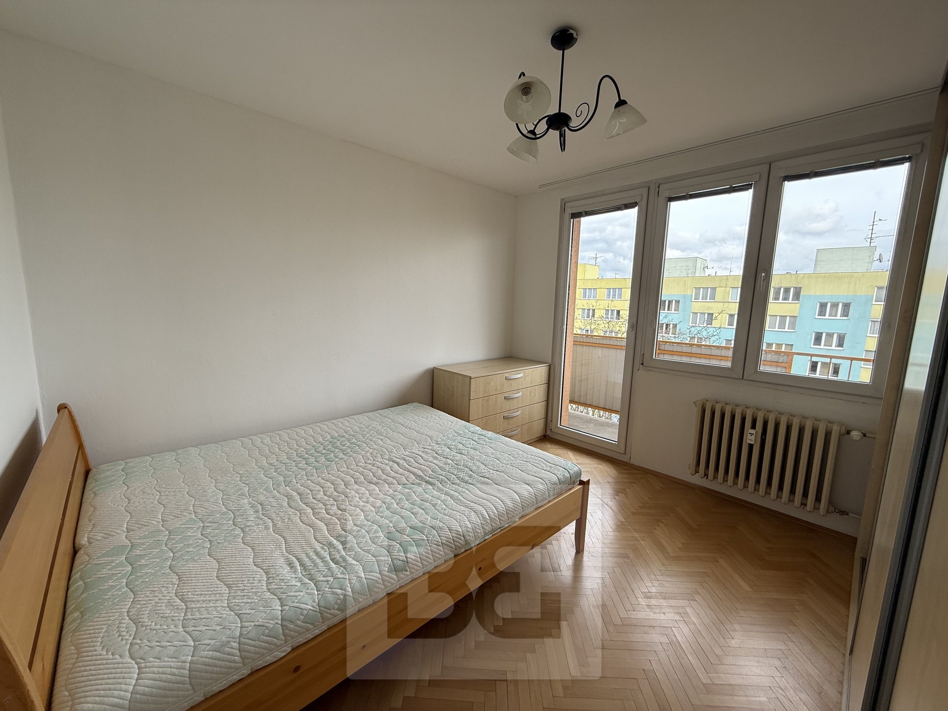 • Samostatná ložnice je vybavená velkou vestavěnou šatní skříní, dvojpostelí a komodou a také se z ní dostaneme na balkón